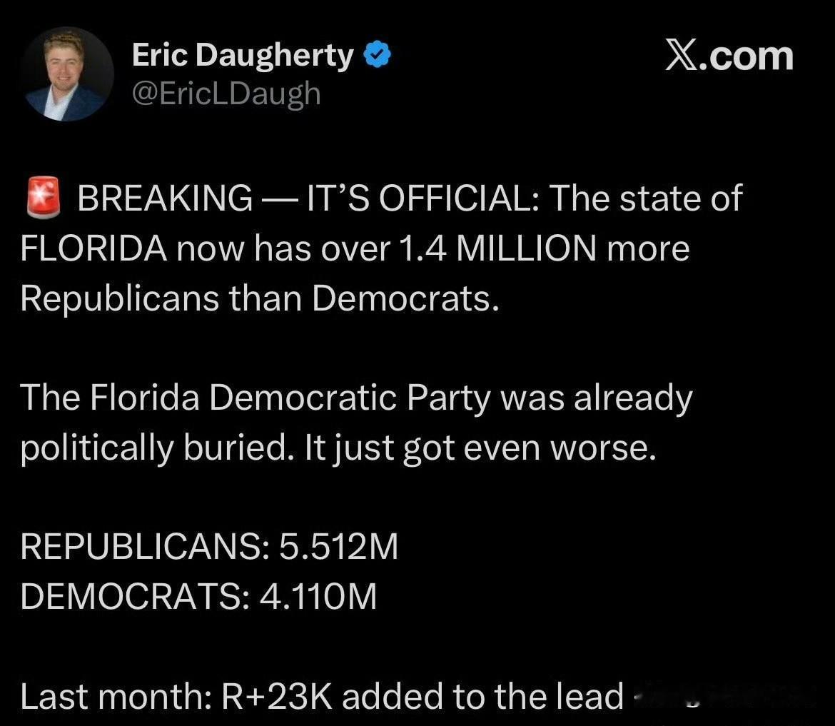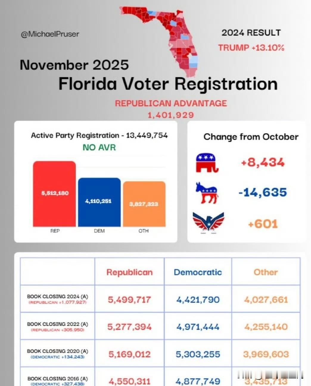 弗罗里达曾经是摇摆州,现在成为实实在在的红州,共和党选民比民主党选民多出一百四十万。