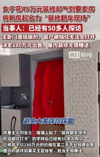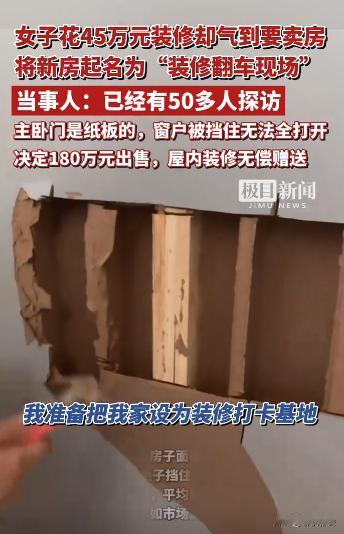 “遇到狠人了!”安徽阜阳,女子买了套160平米的大平层,找装修公司花45万装修,本以为能开开心心入住,结果验房时发现问题百出,一气之下,女子直接邀请网友“打卡避坑”,还把新房挂到网上出售,一下让装修公司火了一把 10月30日安徽阜阳的刘女士(化名),特意从杭州请假回来看刚装修好的房子,推开门的瞬间,整个人都懵了 ,盼了 15 年的 160 平米大平层,怎么就成了这副模样? 主卧门板用手一戳,“空空” 的响,设计师过来说这是 “实木复合门”,想换质量好的,得再加钱,阳台更离谱,地漏被瓷砖盖得严丝合缝,以后拖地、下雨积水,水往哪儿排? 最让她心疼的是花 9 万订的柜子:餐边柜按咖啡机尺寸定的,结果机器放进去一半露在外面,量了下比设计图少 10 厘米,阳台柜子离窗户太近,门最多开一半,封边歪歪扭扭,板材颜色都不一样。 谁能想到,为这套房刘女士熬了整整 15 年。 从 20 多岁在杭州打拼,到 38 岁终于攒够钱买下这处大平层,她对装修更是上心 ,没选便宜的,专门在社交平台找了口碑好的公司,一下投了 45 万预算。 因为在杭州上班,没法天天盯现场,她每天加班到半夜,都要跟妹妹、设计师微信沟通进度,连窗帘、餐具这些软装都提前买好,就等着装修完赶紧搬进去。 可现在,所有期待全碎了。 找装修公司要说法,负责人态度特别冷淡:“合同里没写地漏必须露出来,柜子尺寸差一点很正常。” 还说想整改可以,得先交 3 万尾款,整改的钱自己再掏。 刘女士气坏了,接下来三个月跑断了腿维权,可连个靠谱的解决方案都没拿到。 就在她快绝望的时候,突然想通了:既然没人管,不如让大家都来看看这 “翻车现场”,给准备装修的人提个醒。 她把家里的普通门锁换成智能远程锁,拍了条视频发网上,邀请网友来 “打卡避坑”。 没想到第二天就有人来 ,一个准备装修的小伙子,带着自己的装修合同,一条一条对着她家的问题比对。 后来还有退休的工程师,拿着图纸过来,指出柜子尺寸错在哪儿,怎么改才合理,装修博主也来拍视频,教大家怎么检查瓷砖贴得好不好、柜子封边合格不合格。 短短三个月,有 50 多人专门来参观,她家反倒成了小区里的 “装修教学点”。 网友们看了也纷纷留言,说自己装修时也踩过类似的坑:有人家合同写的是品牌电线,结果被换成了杂牌,幸好有电工亲戚发现得早,才没出大事。 刘女士后来查了 2025 年中国家装行业协会的报告,上面说要是业主选全包模式,又不能全程盯着,材料被偷换、工艺缩水的概率会超过 30%。 她当初每次都跟设计师核对材料、确认方案,可还是没躲过。 15 年的积蓄眼看要打水漂,刘女士最后决定把房子卖了,标价 180 万,跟当初买房时差不多,还特意注明 “装修免费送”,哪怕自己要承担近 10 万的增值税。 现在杭州出租屋里,她之前买的上百个软装快递还堆着,箱子上都积了灰。 最后一次去新房,刘女士站在阳台,摸着墙面上不对齐的瓷砖,看着玻璃上贴的 “避坑打卡” 标语,满是遗憾。 其实大家装修都想有个舒服的家,但再好看的样板间,施工时也得盯紧;预算再多,不如找个有责任心、守良心的装修公司。 刘女士的经历,也算给装修行业敲了个警钟。 希望准备装修的朋友,能从她的事儿里多学点心眼,少踩点坑。 毕竟,谁的钱都不是大风刮来的,装房子这么大的事,可不能马虎。 对此,你有什么看法呢?