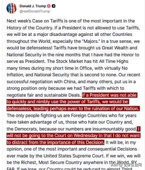 川普:下週關於關稅的案件,是本國歷史上最重要的案件之一。 如果總統不能使用關稅,我們將在與世界各國,特別是「主要國家」的競爭中處於重大劣勢。 在真正意義上,我們將毫無防禦能力! 關稅為我們帶來了巨大的財富和國家安全,這是在我擔任總統的頭幾個月內就實現的成果。 股市創下歷史新高無數次,在我短短任期內幾乎沒有通貨膨脹,並且國家安全達到了世界頂尖水準。 我們最近與中國的談判和許多其他國家的談判之所以能夠強勢進行,就是因為我們擁有關稅這項可以用來談判公平和互惠協議的武器。 如果總統無法迅速而靈活地運用關稅的力量,我們將毫無防禦能力,甚至可能導致國家的毀滅。 目前唯一在反對的,是那些多年來一直佔我們便宜的外國勢力,以及那些憎恨我們成就的民主黨人,因為我們的人數多到他們根本無法戰勝。 我將不會在星期三出庭,因為我不想轉移人們對這項裁決重要性的注意力。 在我看來,這是美國最高法院所作出的最重要、影響最深遠的裁決之一。 如果我們勝訴,美國將繼續是世界上最富有、最安全的國家; 但如果我們敗訴,我國可能會被削弱到只剩「第三世界」的水準—— 向God祈禱,但願這種情況不會發生!