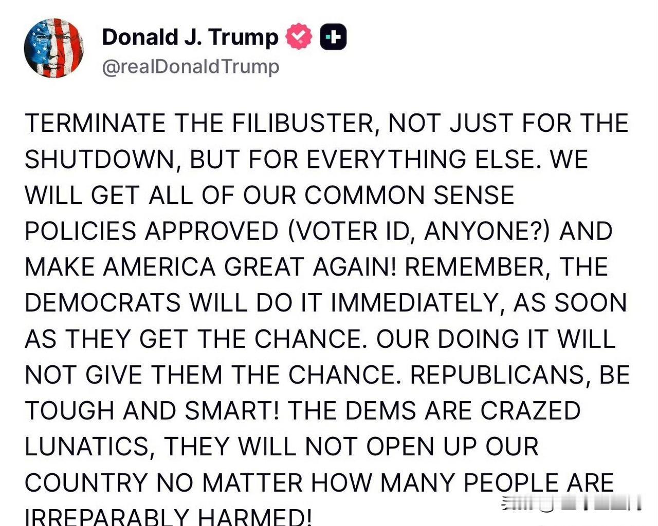 ‼️特朗普再批民主党:“终止阻挠冗长辩论,不只针对政府关门,还包括所有其他事项。我们就能通过所有那些合情合理的政策(比如选民身份证,谁不支持?),让美国再次伟大!记住,民主党人一有机会就会立刻这么做。我们先下手,就不会给他们机会了。共和党人,要坚强聪明点!民主党人就是一群疯狂的疯子,无论多少人遭受永久伤害,他们都不会开放我们的国家!”