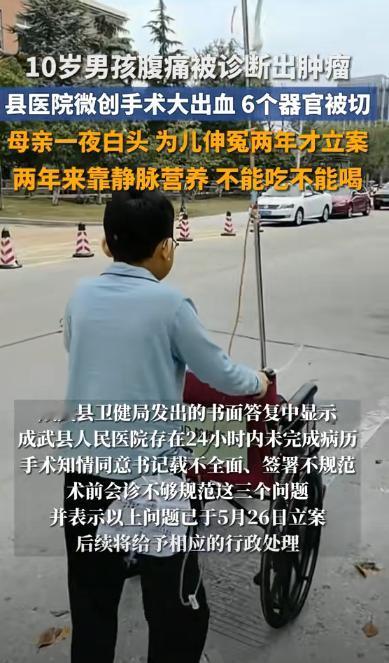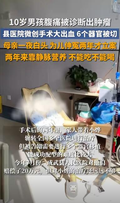 山东菏泽,10岁男孩被同学撞了肚子,他就一直肚子疼,妈妈带他去县医院,竟然检查出他的腹腔内有肿瘤,要做手术,结果手术一做做了14个小时,直接切掉了男孩的十二指肠,胰腺,还有大部分的胃和小肠。 山东菏泽 10 岁男孩小烨(化名),就因为在学校和同学玩时被撞了下肚子,最后竟被切走了十二指肠、胰腺、大部分胃和小肠 —— 好好的孩子,术后连正常生活都成了难题,这事儿想想都让人心疼。 事情得从那次磕碰说起。 一开始小烨就说肚子有点酸,可没过多久,疼得越来越厉害,走路、坐下都费劲。 妈妈岳女士赶紧带他去县医院检查,最初医生说是腹部血块,可越查越严重,最后说孩子胰腺和胃之间可能有肿瘤,必须手术。 岳女士当时心都慌了,哪敢耽误,赶紧签了腹腔镜探查的同意书。 可手术中,医生一次次出来让她签各种协议,岳女士心里开始犯嘀咕:这手术咋这么多要签的? 她提出想转院,可医生说孩子病情不适合转,必须接着做。 就这么着,手术足足做了 14 个小时。 等小烨被推出来,岳女士一看直接懵了 , 孩子肚子上的伤口不说,医生还告诉她,手术中把孩子的十二指肠、胰腺、大部分胃和小肠都切了! 好好的孩子,怎么就被切了这么多器官?岳女士当时眼泪就下来了,满脑子都是疑问。 之后岳女士要查看完整手术录像,想知道到底咋回事,可医院一直不给。 后来第三方鉴定出来,说医院术前准备和风险评估有过错,根本不是啥非做不可的 “紧急情况”。 岳女士更气了:自己当初根本没被说清风险,签的同意书,倒像成了医院推卸责任的挡箭牌。 现在岳女士为了全职照顾小烨,早就辞了工作。 医院只给了 20 万赔偿,可孩子后续治疗还长着呢,这点钱根本不够。 家里经济压力大,看着孩子遭罪,岳女士夜里都睡不着觉。 她现在打定主意要走法律途径,就想让医院公开手术录像和细节,追究责任,也为孩子争取该有的赔偿。 这事儿也让不少人后怕:咱们去医院看病,最怕的就是医生不说清风险,稀里糊涂签了字,最后出了问题还没处说理。 说到底,患者的知情同意权不是光签个名就行,得让咱们真明白手术有啥风险、有啥可替代方案。 医院要是连这点都做不到,怎么让患者放心? 希望小烨能早日好起来,也希望这事儿能给医疗行业提个醒:别让 “签字” 成了形式,生命容不得半点马虎! 对此,你还有什么看法呢? 信息来源 :荆楚网