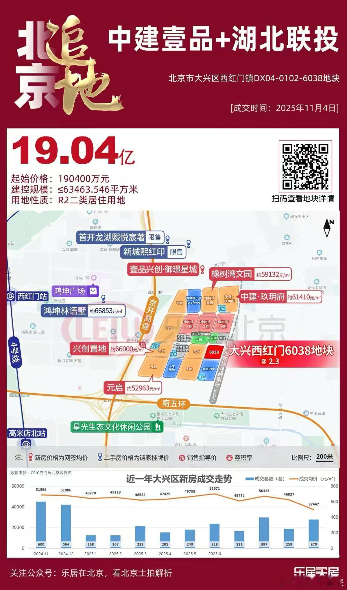 19.04亿!中建壹品+湖北联投底价竞得大兴西红门东的6038地住宅楼面价约3万元/㎡。