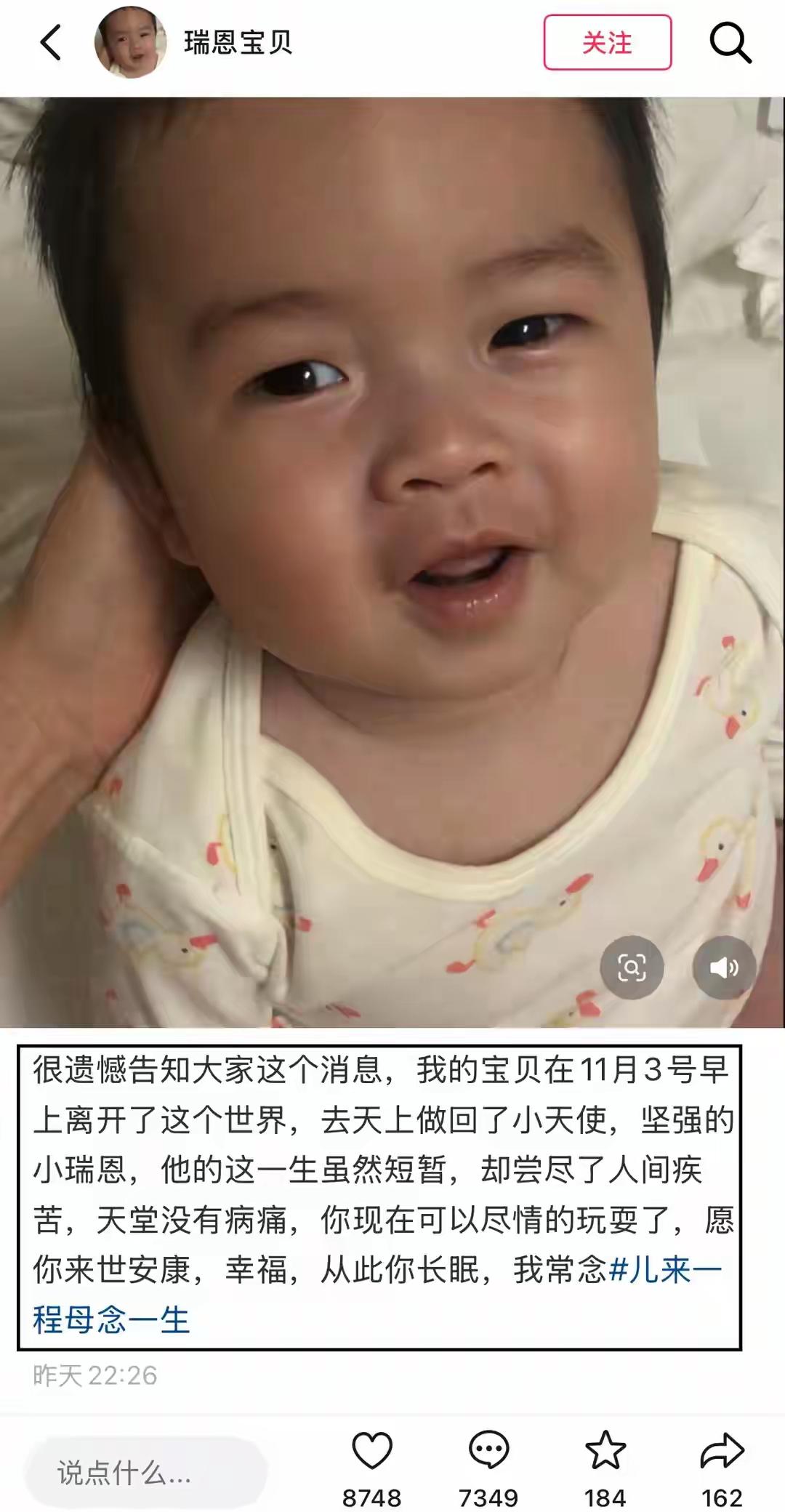 11月3日,博主“瑞恩妈妈”发动态说,3岁的“瑞恩宝贝”早上不幸离世了。瑞恩是泛生活领域的创作者,账号主要分享亲子日常,到今年11月已经有13.3万粉丝,获赞236.4万次。他出生于2022年9月,离世时还不满4岁。 这是一起令人心碎的消息。3岁的瑞恩宝贝的突然离世对他的家庭、粉丝和关注他的人来说无疑是极大的打击和悲痛。作为泛生活领域的内容创作者,瑞恩妈妈的分享也让许多关注他们家庭和孩子的网友感受到真实而深切的情感。 这类事件提醒我们,每一个生命都非常宝贵,无论年龄大小,都值得被珍惜和爱护。在这个时候,愿瑞恩宝贝安息,也愿他的家人能够找到慰藉,逐渐走出悲伤。对于关心这件事的公众,也希望大家能够给予更多的理解和关怀。 如果你需要具体的帮助或想了解应对类似悲剧的方式,也可以告诉我。宝宝离世 佳恩妈妈