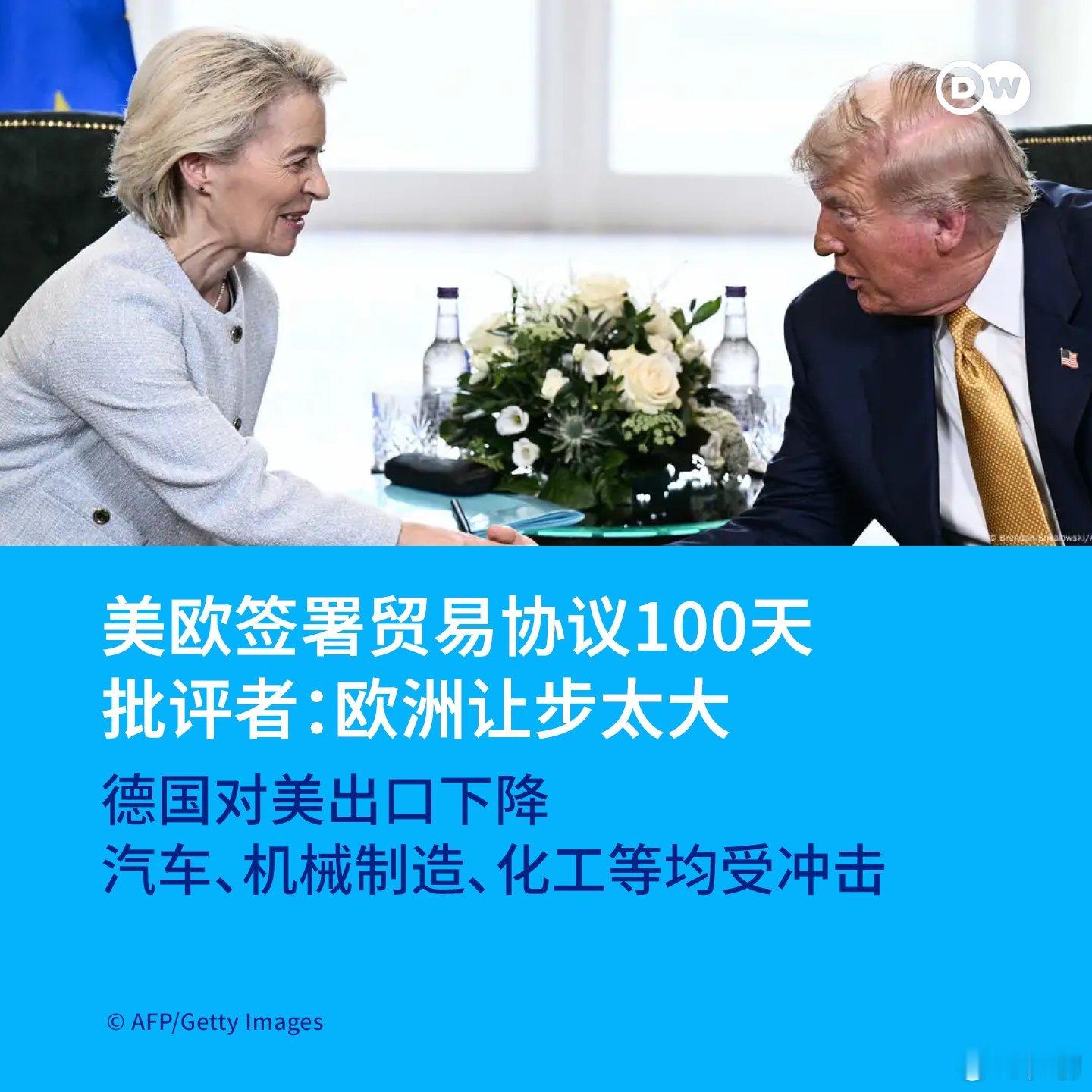 法新社:美欧签署贸易协议100天,批评者认为欧洲让步太大,德国对美出口下降汽车、机械制造、化工等均受冲击。