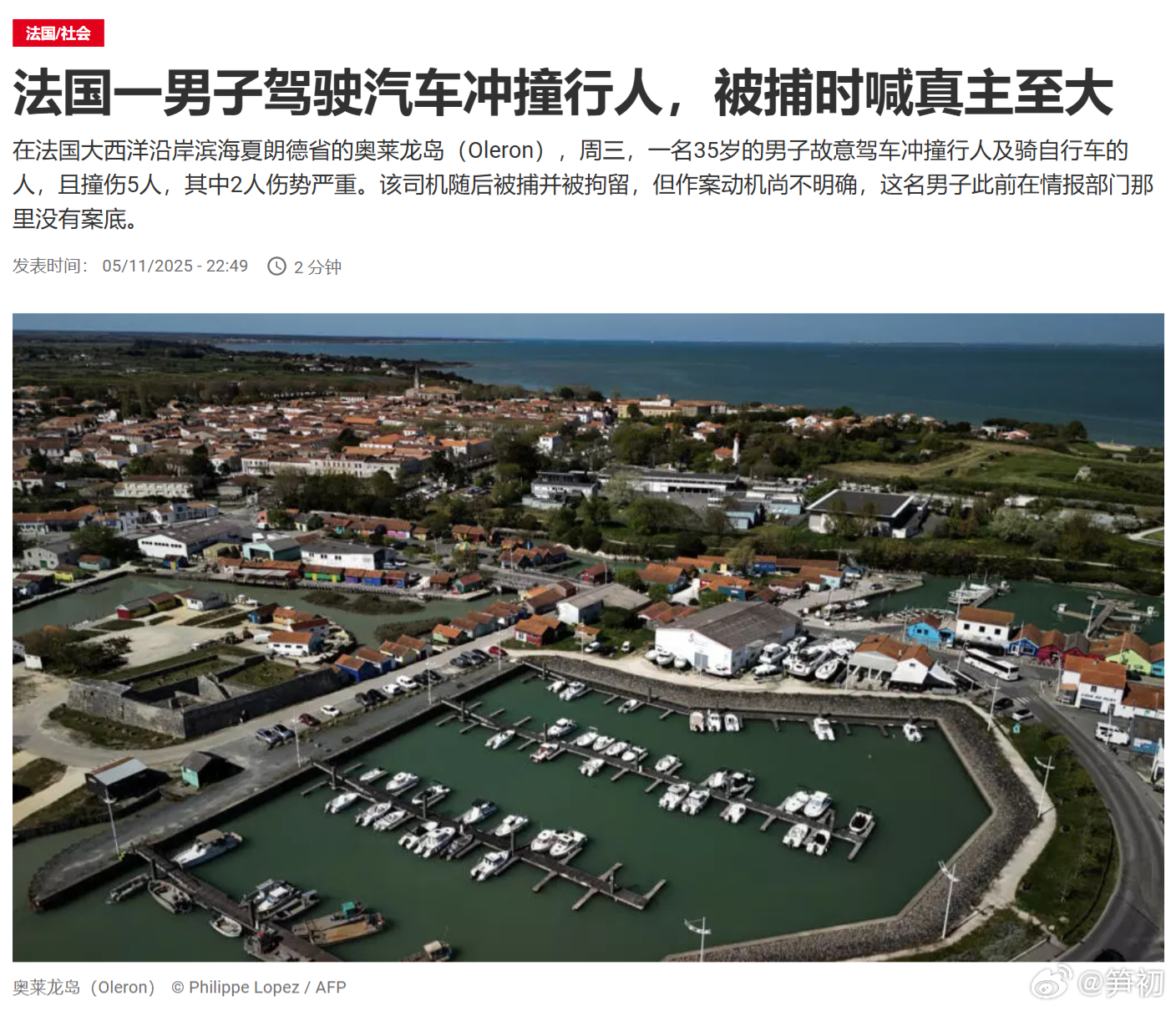 法新社:法国一男子驾驶汽车冲撞行人,被捕时喊真主至大。在法国大西洋沿岸滨海夏朗德省的奥莱龙岛,一名35岁的男子故意驾车冲撞行人及骑自行车的人,且撞伤5人,其中2人伤势严重。