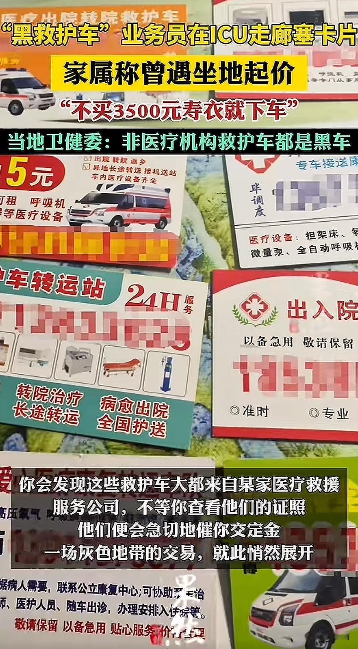 郑州多家医院ICU走廊里,黑救护车业务员到处塞卡片揽客,宣称能快速调车、指定跟车医生。这些黑救护车大多挂靠虚假机构,没正规资质,还藏着不少猫腻,有家属被坐地起价,不买3500元寿衣就被威胁扔下车,收费比正规救护车高好几倍。 ICU外家属本就心急如焚,黑救护车却趁人之危坑钱,既危及患者安全,又寒了人心。好在六部门已启动为期一年的专项整治,严查资质造假、乱收费等问题。希望这次能彻底清剿黑救护,同时补齐正规转运服务短板,让家属不用再为转运犯愁,也守住生命最后一道防线。