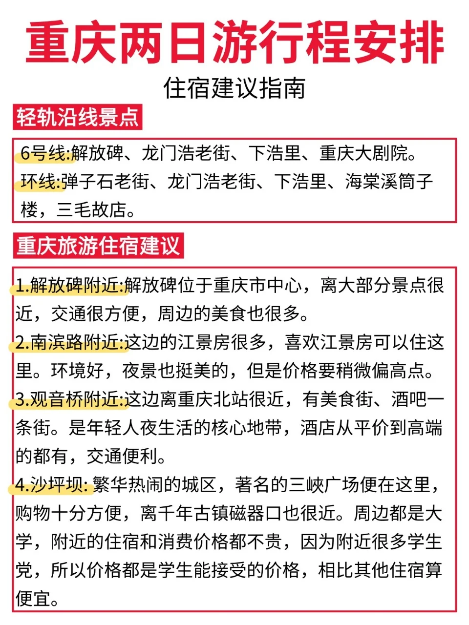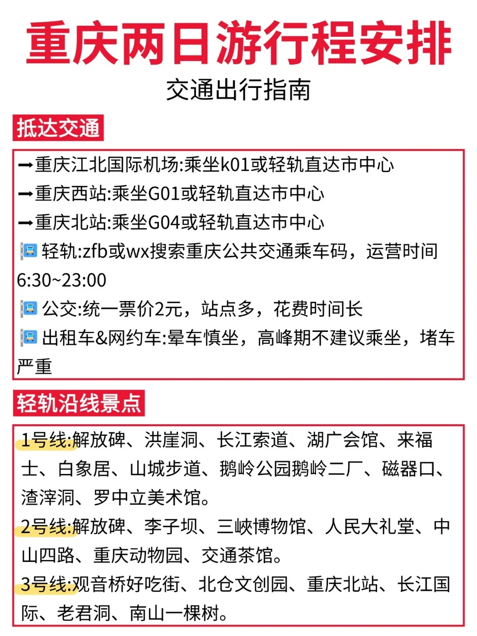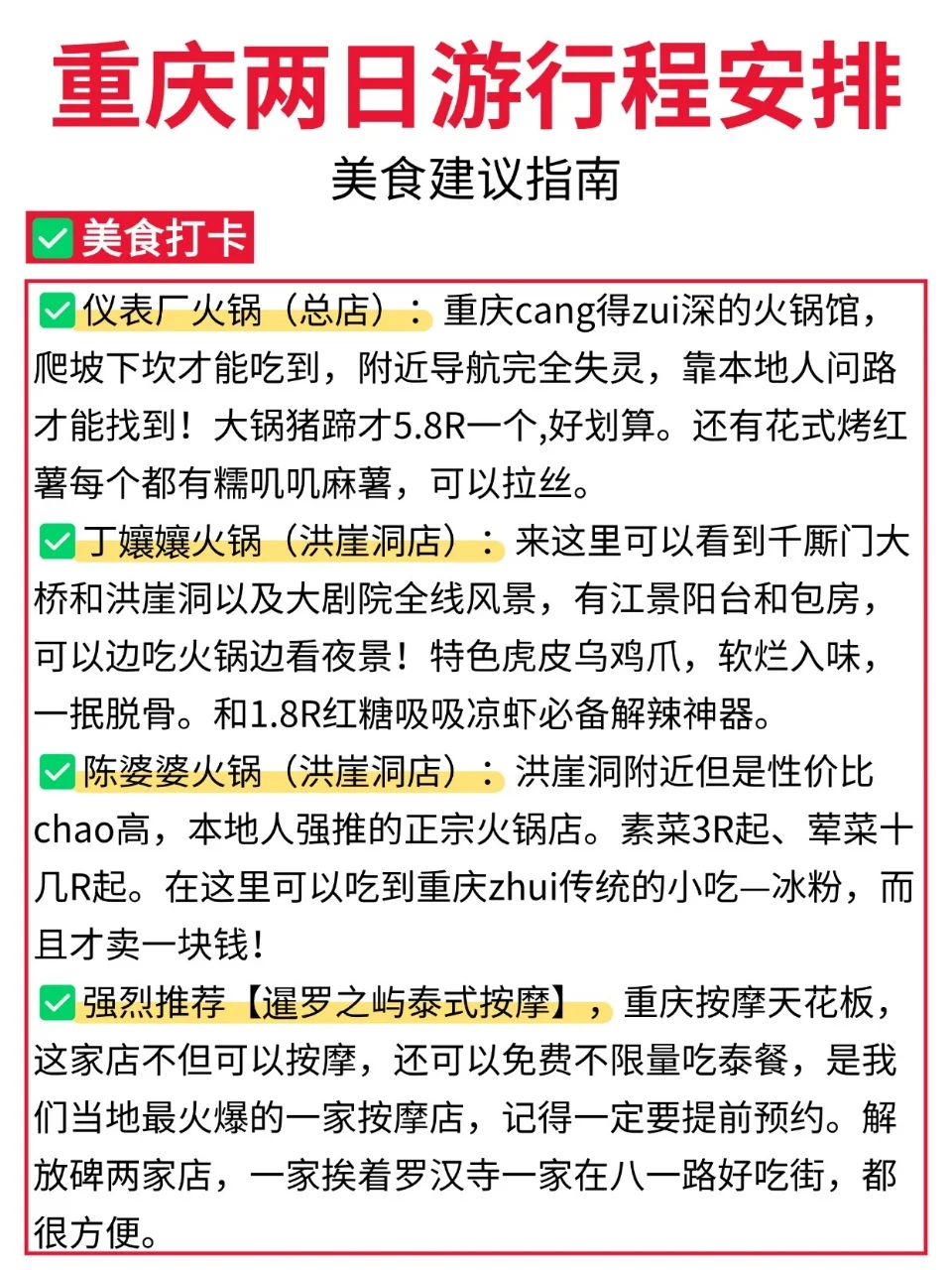 想去重庆,但是又只有两天时间的uu们,看过来咯👀!今天来为各位uu们分享一篇重庆两日游,都是本人亲测的! 既能游玩到热门景区🔥又能感受重庆的氛围🎇还能吃到各种重庆地道的美食😋真心推荐!