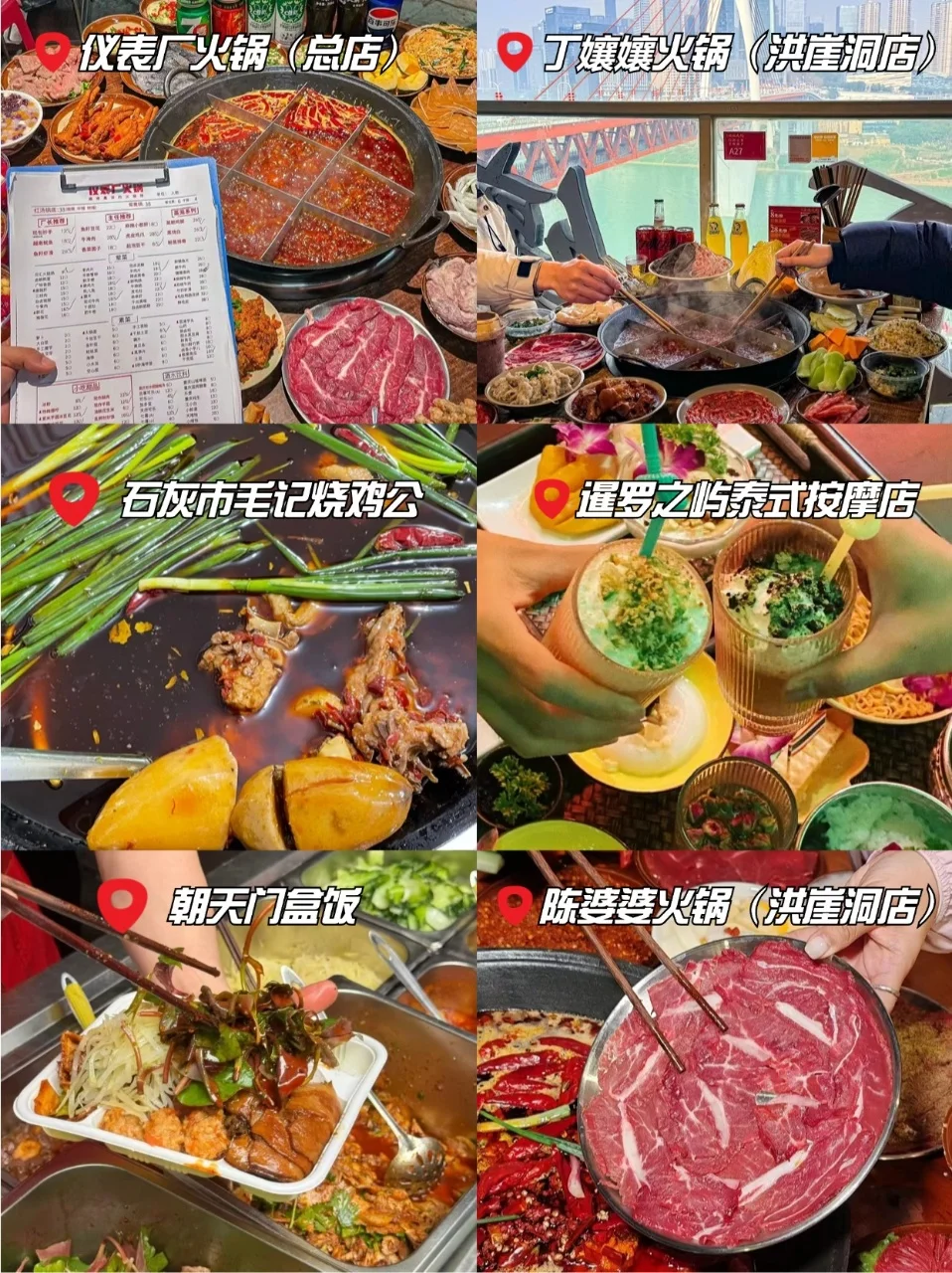 📍丁孃孃火锅(洪崖洞店)、📍仪表厂火锅(总店)、📍陈婆婆火锅(洪崖洞店)