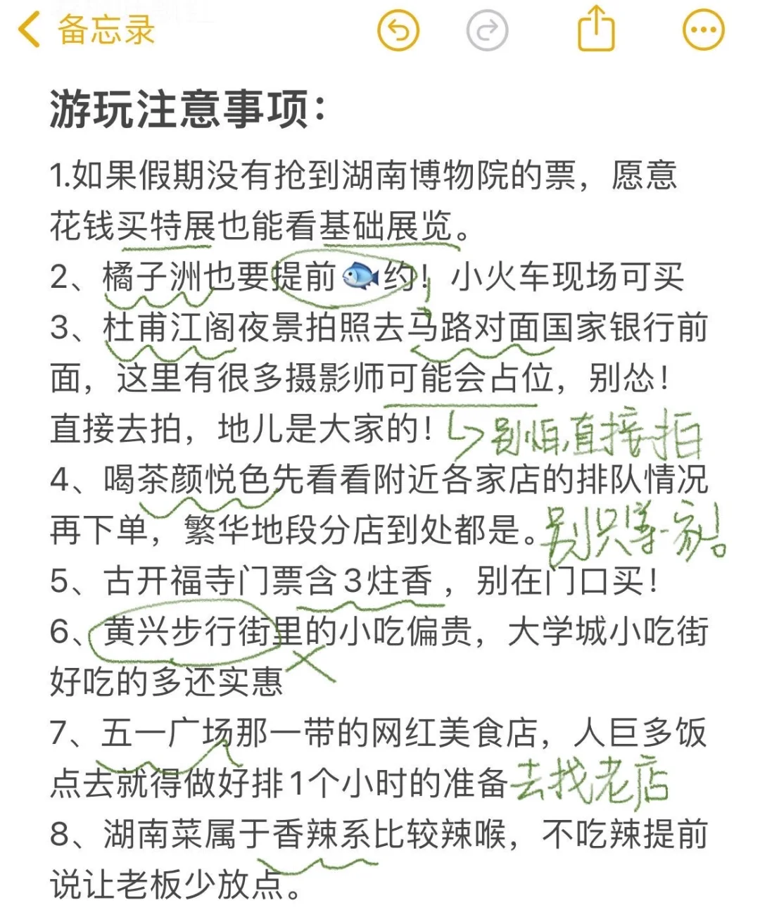 长沙两天三夜足够啦,景点其实不多,做好攻略整个旅程会非常愉快😀上图👆👆都是总结的我们亲身经历感受,基本涵盖的出行的方方面面,算比较全面啦 还没去过的朋友也可以参考噢‼️如果你去过,欢迎分享你的经验😋