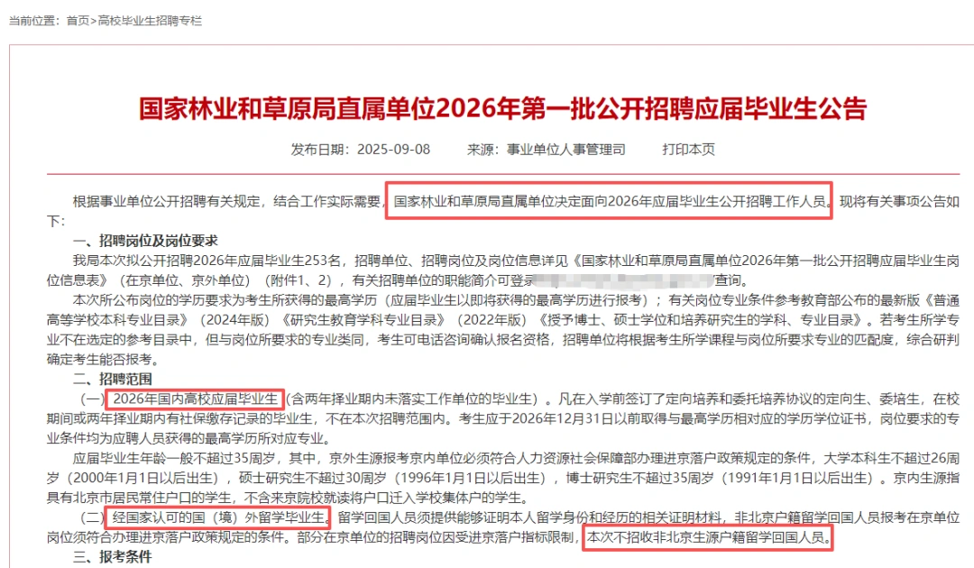 ✅林业局每年都是最快的,一般来说事业单位的集中爆发期都是春招,少部分单位才会提早出现。 🎈本次林业局直属单位计划招生253名应届毕业生,包括留学生,在京事业单位解决编制户口。 ✅文科生同学可报宣传岗位,京内留学生同学同样可以报名,择业期应届生也可以报名。 🎈泛体制内单位现在已经全线开启了!事业单位、央国企、媒体单位已经全部出现校招了,同学们,真的要开始紧张起来了!!