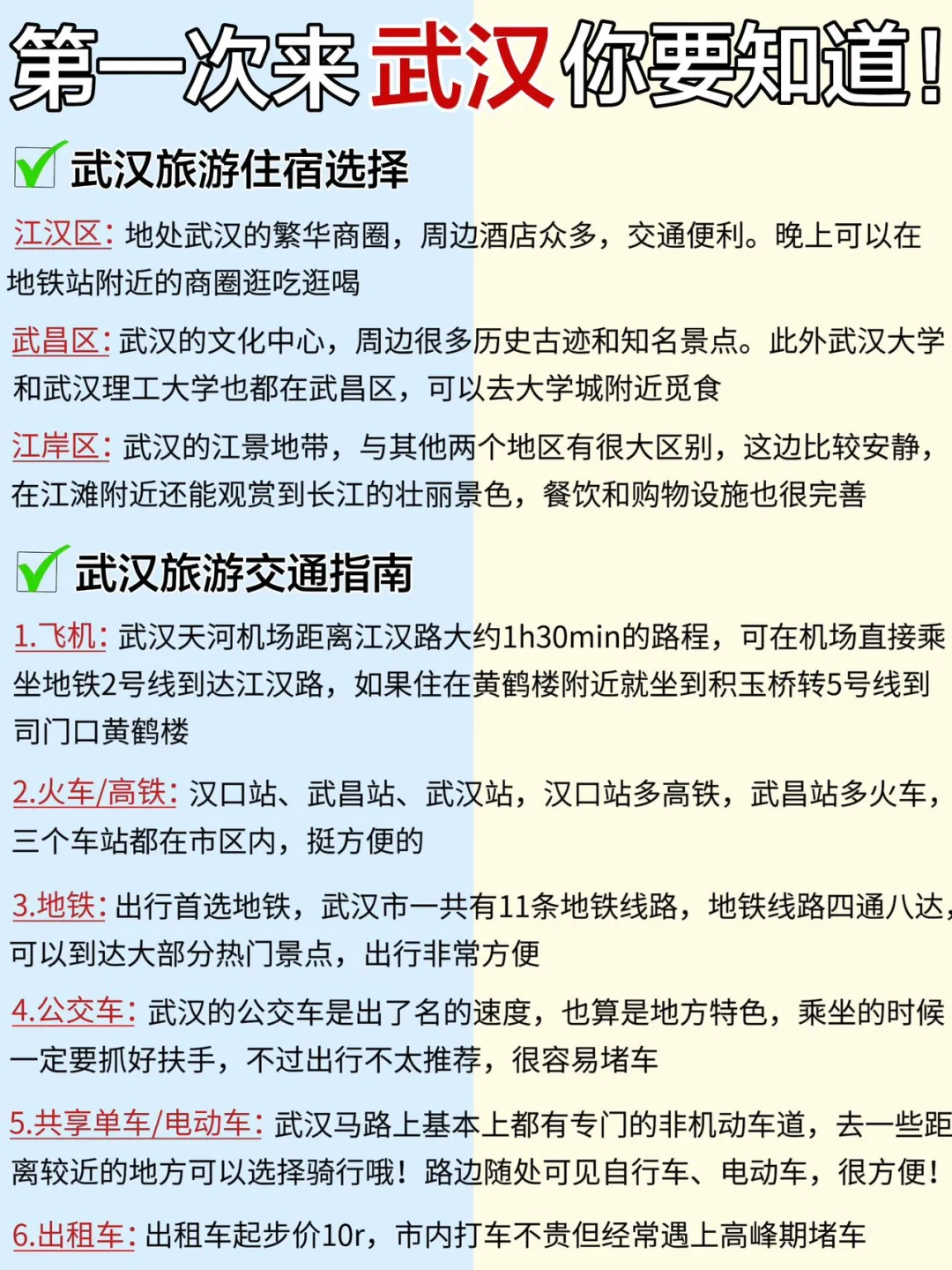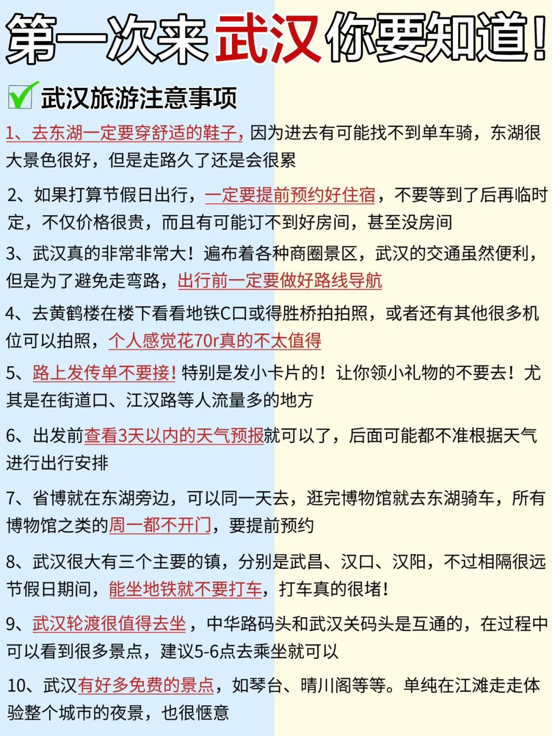 ⑧ 武汉很大有三个主要的区,分别是武昌、汉口、汉阳,不过相隔很远节假日期间,能坐地铁就不要打车,打车真的很堵!