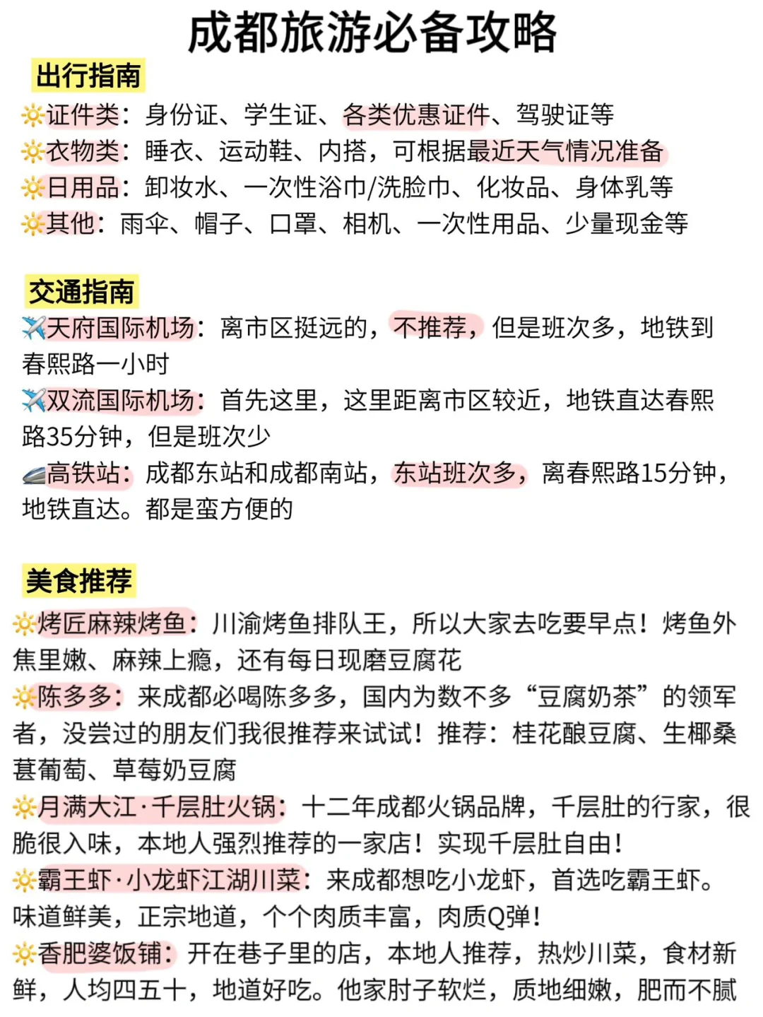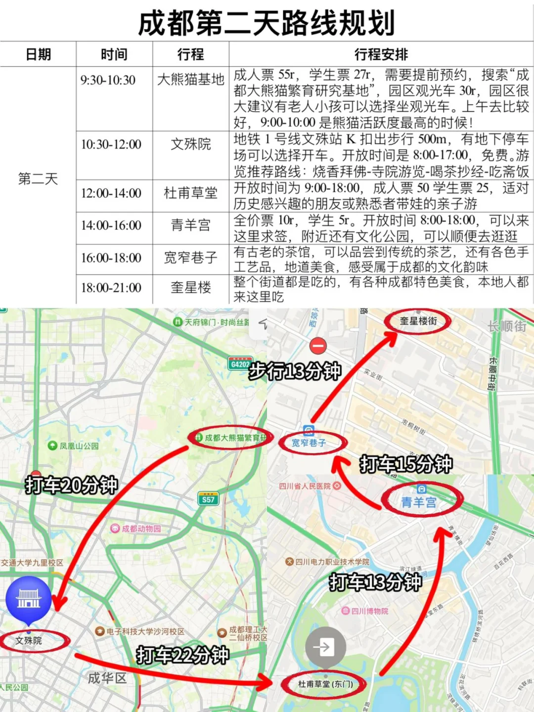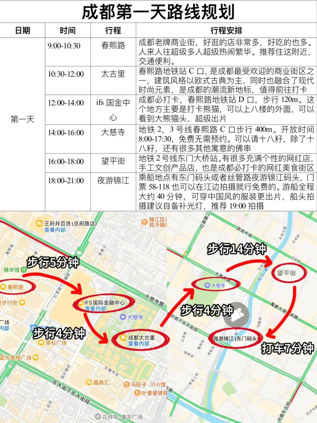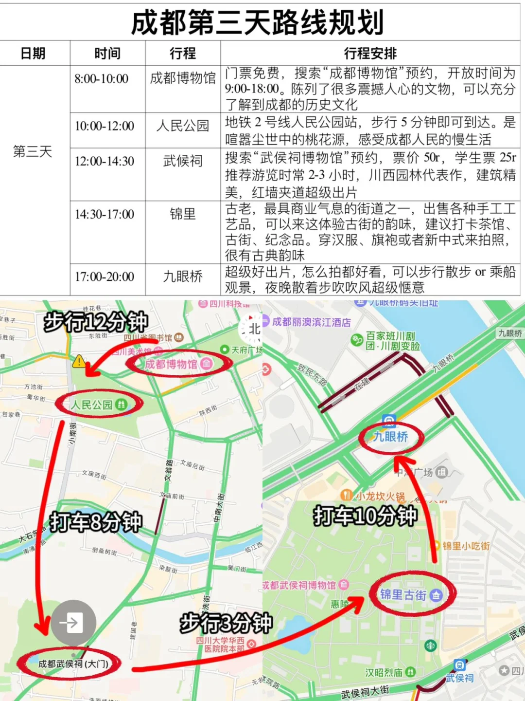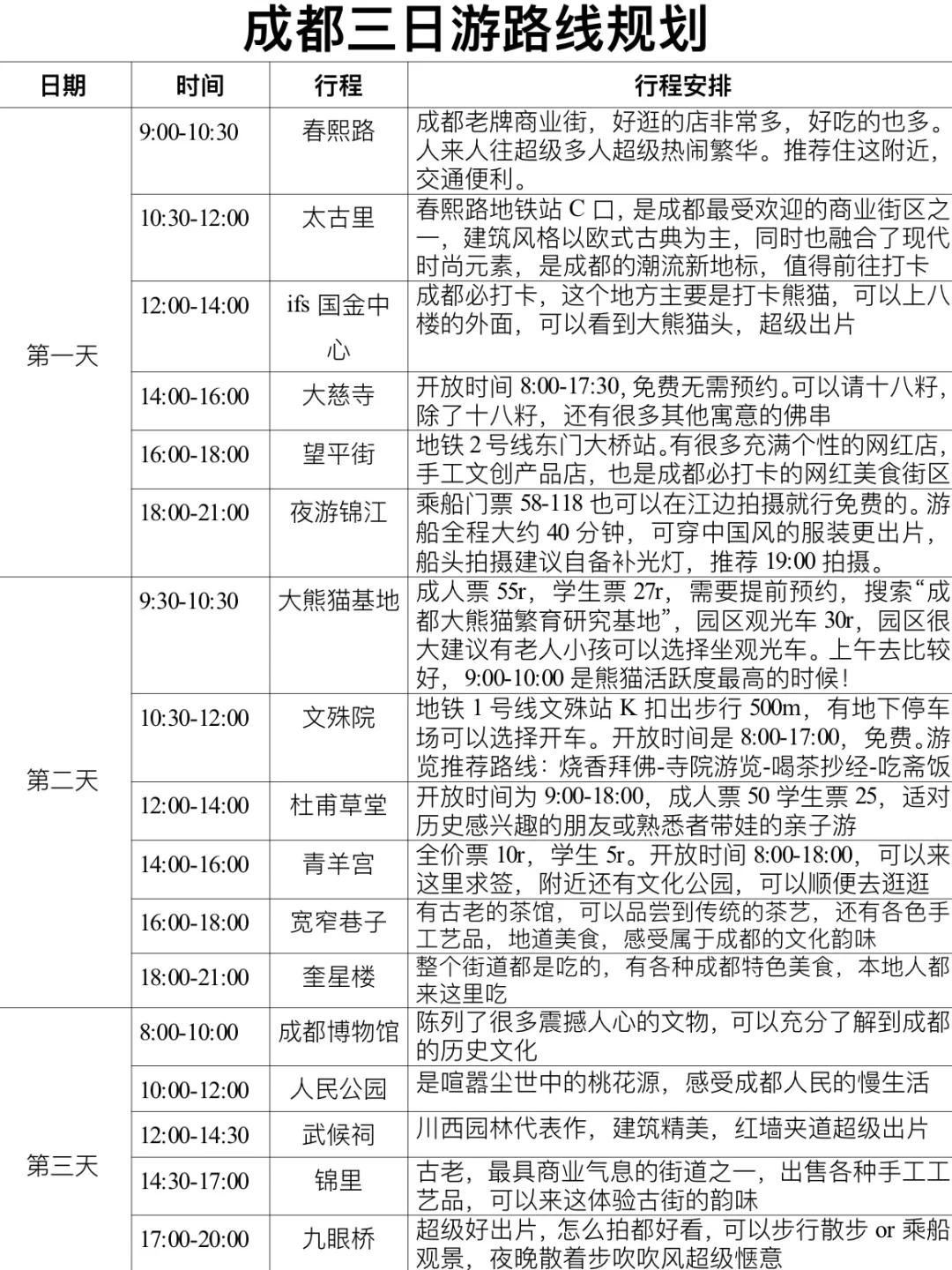 📝熬夜把成都三日游路线给整理出来了! ✨✨有成都游玩路线、出行指南和美食推荐 计划来成都旅游的朋友们记得收藏好!! 🗺️成都路线安排 DAY1️⃣:春熙路—太古里—ifs国金中心—大慈寺—望平街—夜游江景 DAY2️⃣:大熊猫基地—文殊院—宽窄巷子—奎星楼—青羊宫—杜甫草堂 DAY3️⃣:成都博物馆—人民公园—武侯祠—锦里—九眼桥 🏠住宿选择 春熙路附近:热门住宿选址,繁华的商圈,交通便利 九眼桥附近:有很多小酒馆,可以感受成都的夜生活 文殊院附近:民宿多,环境好,周边景点美食也不少,价格适中