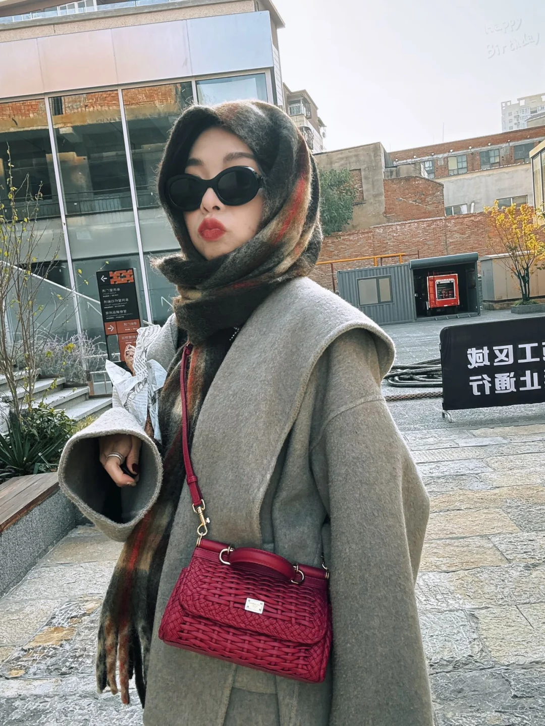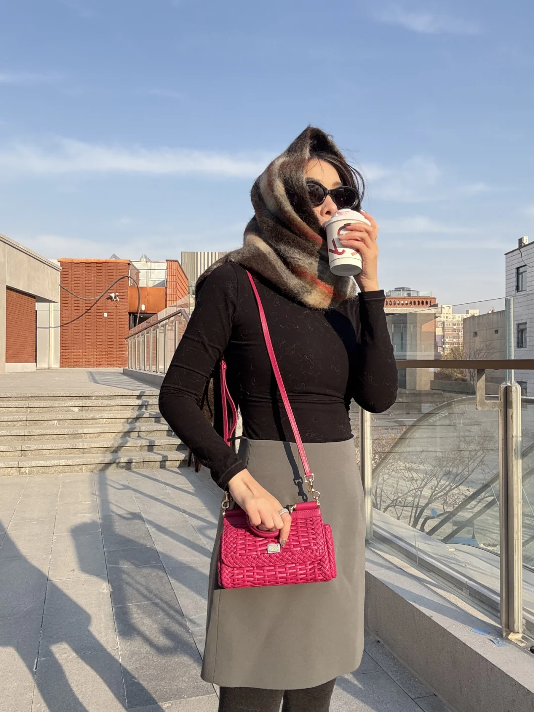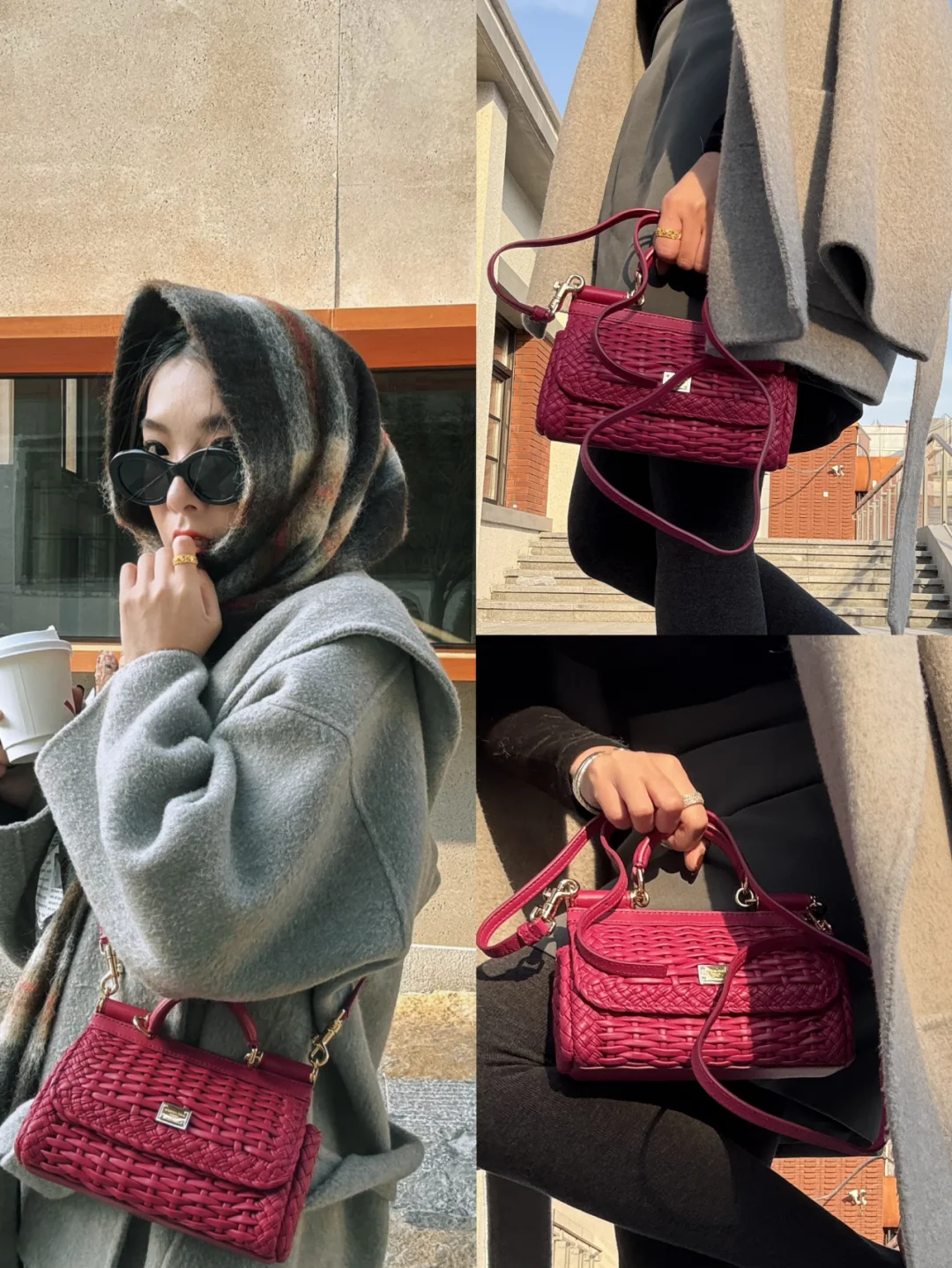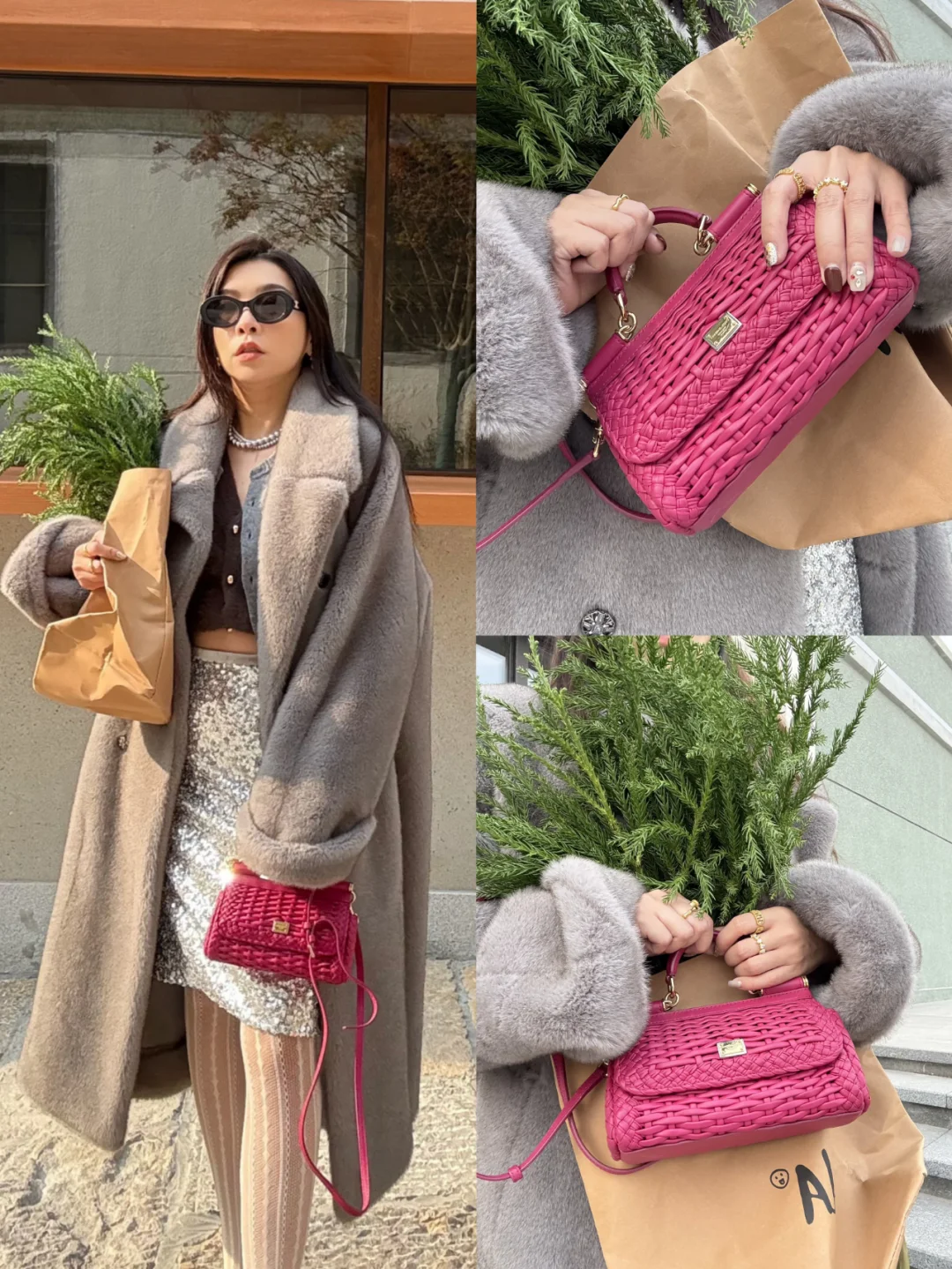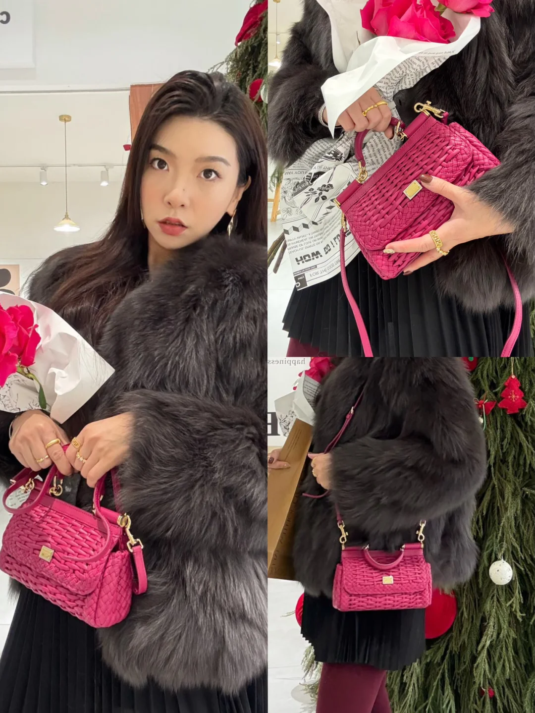 ❤冬日拒绝沉闷,谁不爱这一抹红! 入手了一只DG玫红色编织手提包,撑起年底节日气氛!给冬天点颜色瞧瞧 非常爱它的编织,纳帕皮革材质,很有设计感!是千金名媛的节日首选!在配上灰色长款环保♻皮草搭配保暖精致~怎么搭都好看! 容量轻松出街,可以装下手机 充电宝! 好看又实用,手拎单肩都可以~聚会拿捏恰到好处!