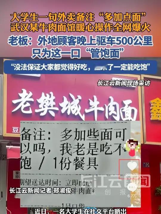一个普通小店通过真诚与坚持赢得顾客认可的感人故事。武汉这家牛肉面馆因为老板对学生“多加点面”备注的积极响应,意外走红,外卖订单暴增四五倍,甚至吸引河南的食客驱车500公里专程品尝。这反映出消费者对真诚服务和用心经营的认可,也彰显了城市中的温暖与人情味。 老板坚持“让人吃饱”的初心,拒绝营销噱头,专注于提供实在的美味和真诚的服务,赢得了网友的广泛点赞(达290万),成为城市烟火气的暖心代表。这一事件不仅让人感受到小店的温度,也提醒我们在快节奏的现代生活中,真诚和用心依然是最打动人心的力量。