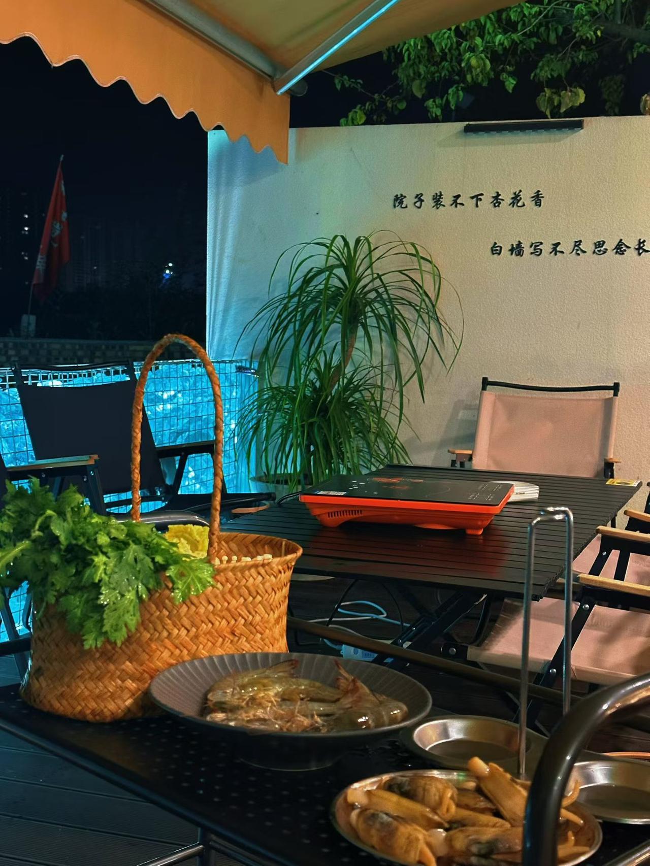家人们,今晚被朋友拐到个神仙小院吃宵夜,一进门就瞅见墙上写着“院子装不下杏花香,白墙写不尽思念长”——这文艺劲儿,给烤串都镀了层浪漫滤镜! 桌上竹篮塞满水灵灵的香菜生菜,鲜虾还带着冰碴儿,鸭掌裹着油光直勾魂,小烤炉往那一摆,晚风裹着绿植味儿往鼻子里钻。抬头能瞅见远处灯光,旁边小红旗飘着,暖棚裹着蓝盈盈的光,连空气都裹着“舒服”俩字! 这哪是吃宵夜啊,明明是把“快活”焊在这儿了!谁来谁迷糊,我已经开始盼着下次来了!