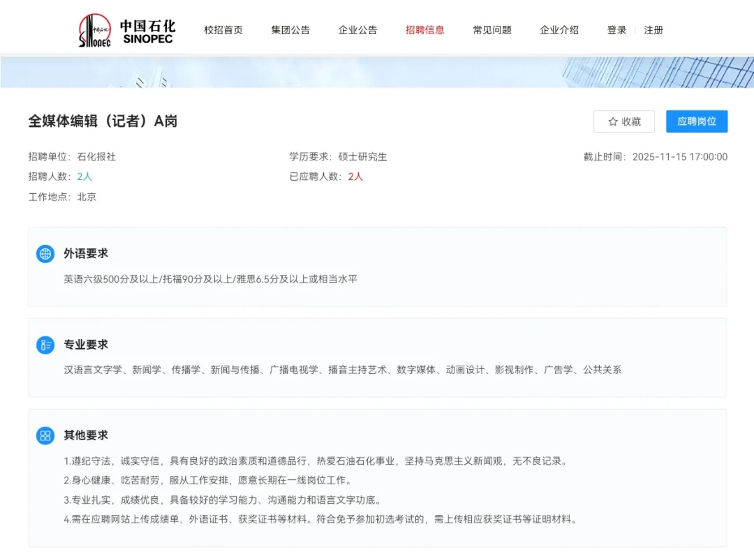 ✅本次中国石化报社招聘人数较多,共招收5人,其中文科类专业:汉语言文学、新闻学传播学、新闻与传播、广播电视学、播音主持艺术、数字媒体、广告、公共关系均可报名,专业限制比较小。