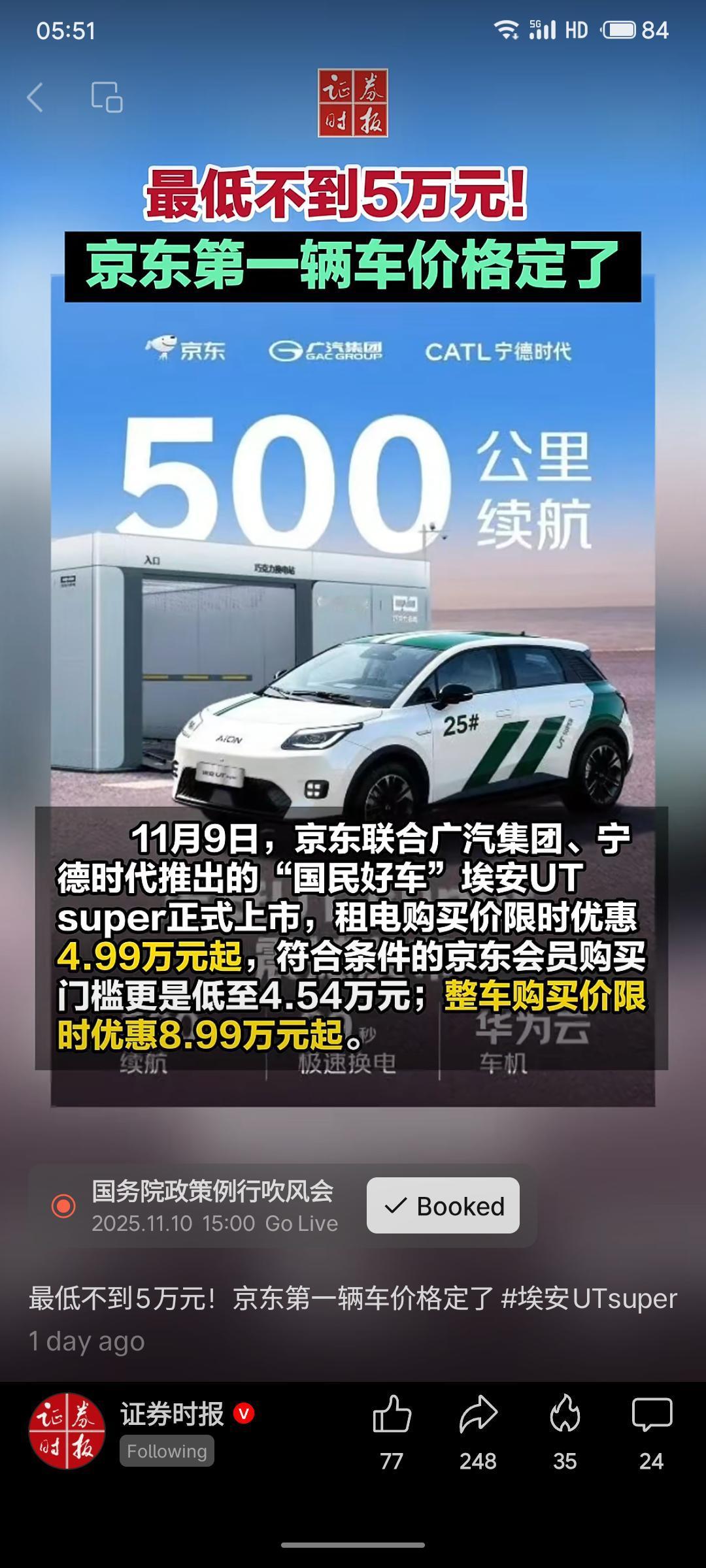 京东联合广汽、宁德时代推出首款“国民好车”埃安UTsuper,11月9日正式上市。租电购买价限时低至4.99万元起,整车购买8.99万元起,京东会员门槛可低至4.54万元,定位高性价比电动车市场。