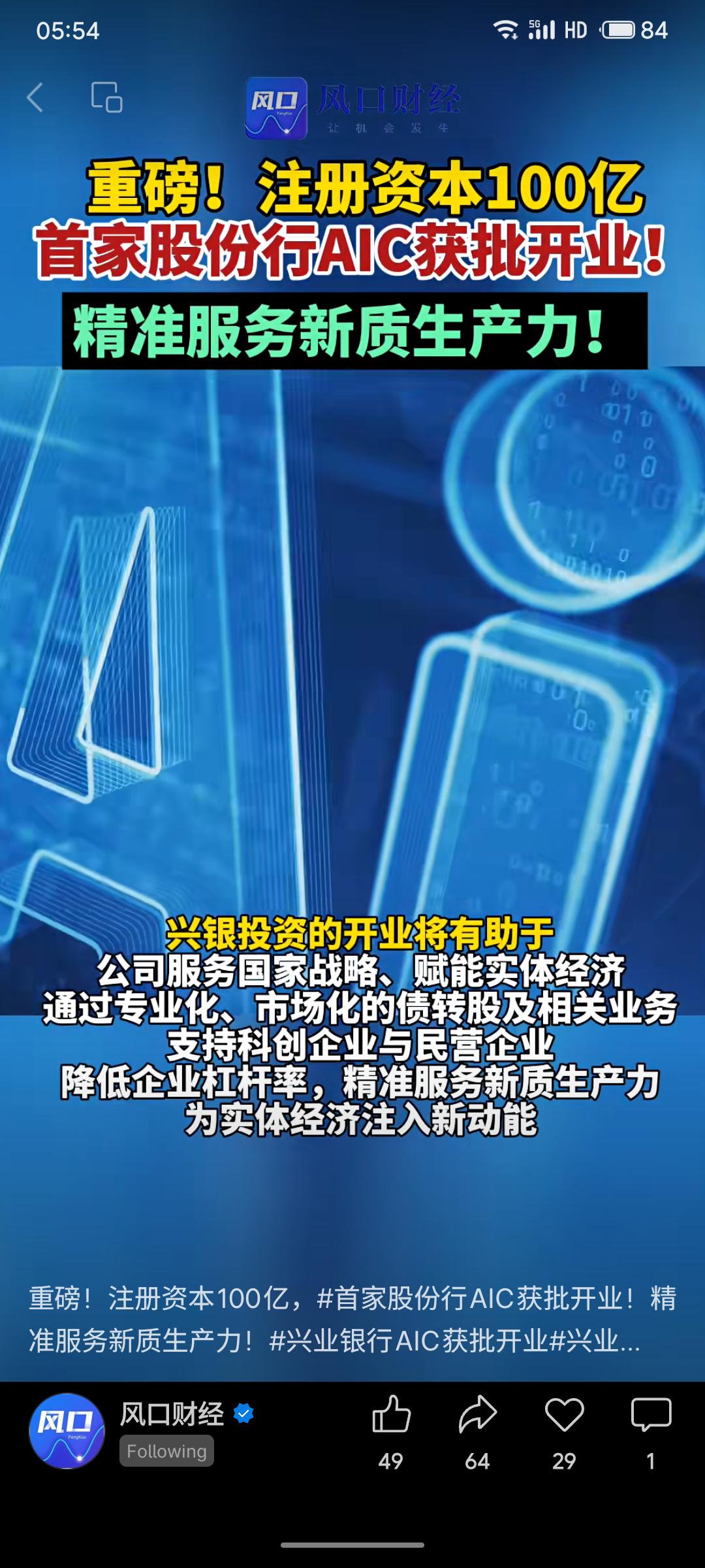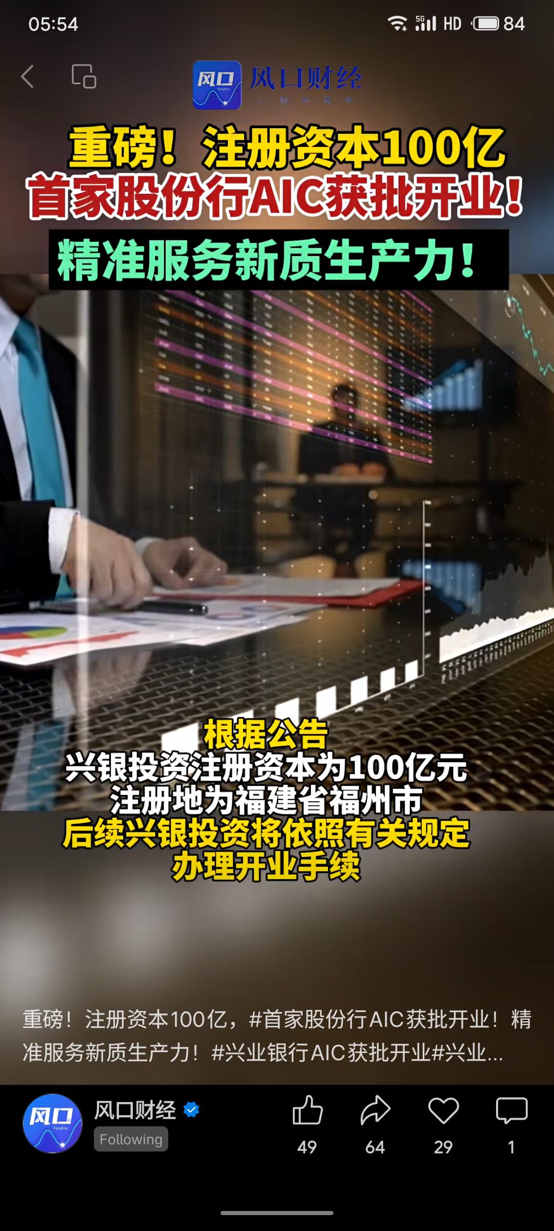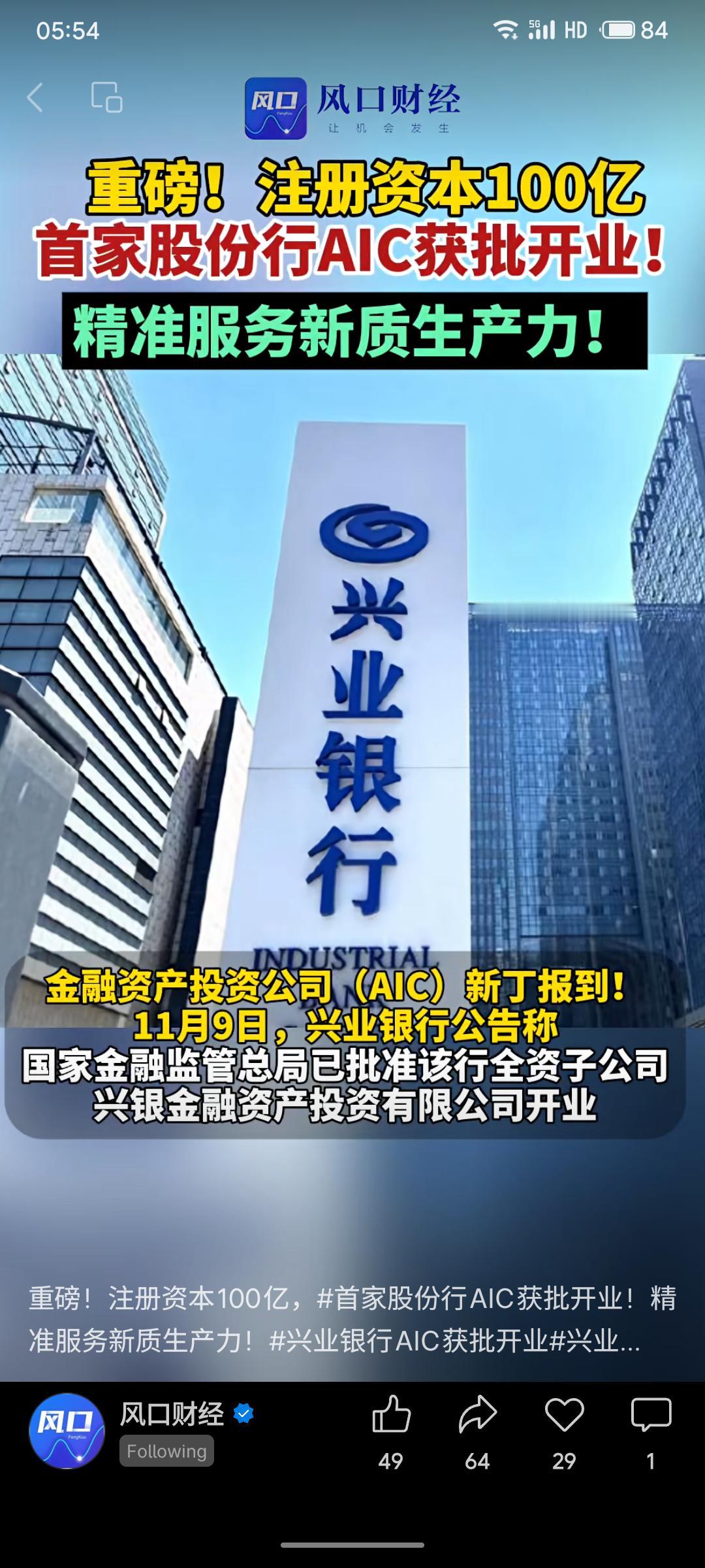 兴业银行全资子公司兴银金融资产投资有限公司正式获批开业,成为国内首家股份制银行设立的金融资产投资公司(AIC)。该公司注册资本达100亿元,注册于福州,将依托专业化、市场化的债转股及相关业务,重点服务国家战略与实体经济,助力科创及民营企业降低杠杆率,精准支持新质生产力发展。