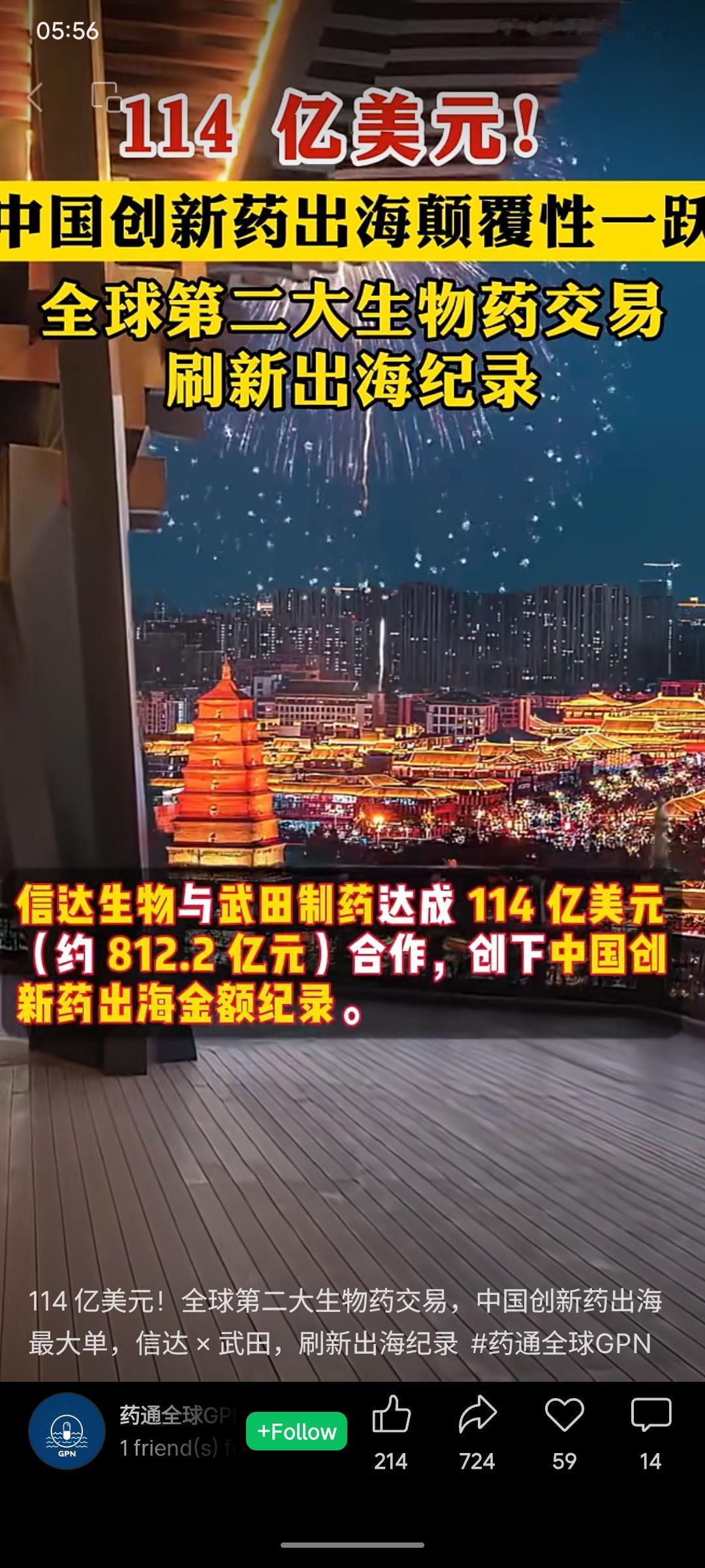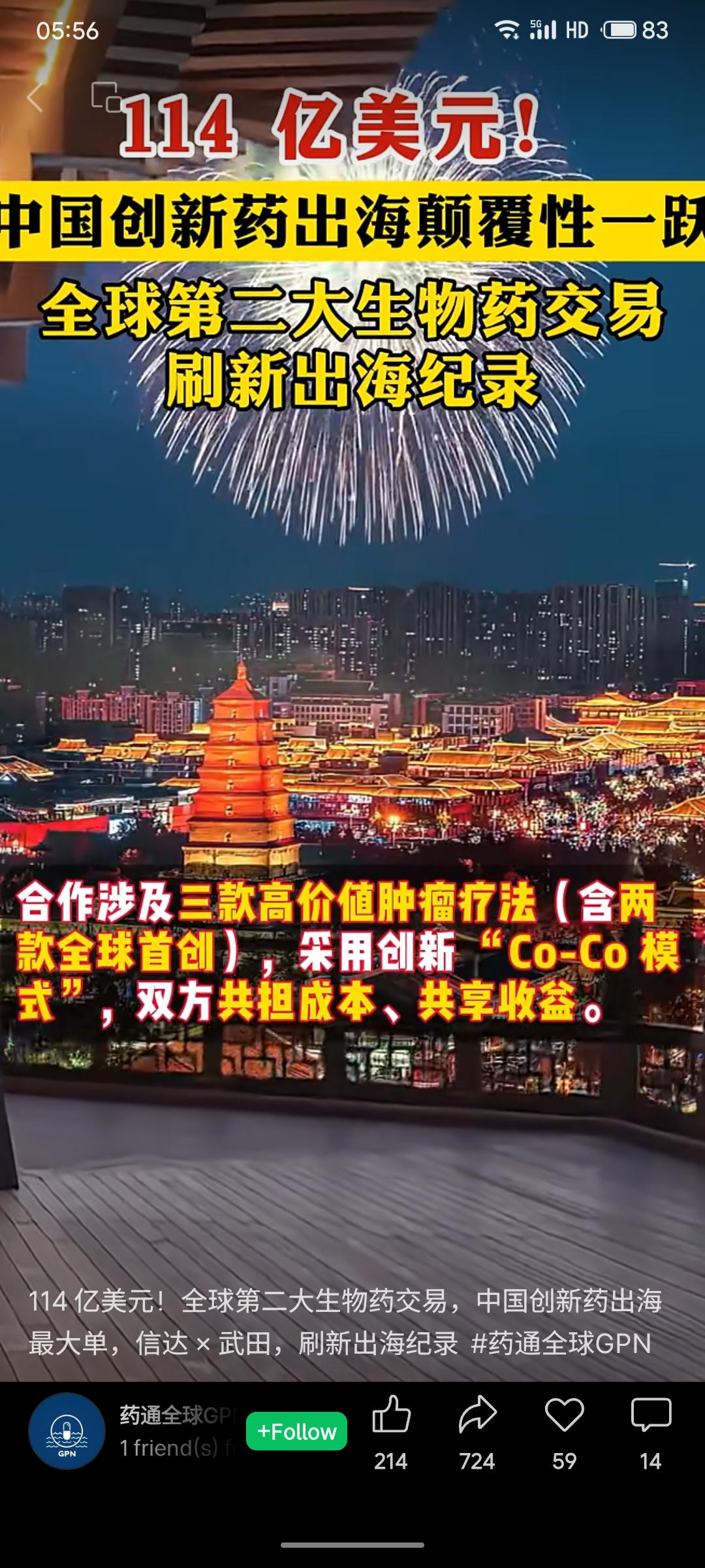 信达生物与武田制药达成114亿美元合作,创中国创新药出海纪录。该交易为全球第二大生物药交易,涉及三款肿瘤疗法,采用“Co-Co模式”共担成本与收益。