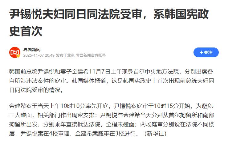 11月7日,将被载入韩国宪政史册,因为这一天,这位“韩国第一夫人”和这位“韩国总统”,在同一天、同一法院出庭,“先例”之多,在韩国史上也是头一遭。 被关了三个月的金建希先出来的,穿件黑外套,瘦得衣服都晃荡,以前精心养的黑长头发,现在白了一多半。口罩没遮住的脸凹进去一块,听说体重掉了不少,旧衣服都撑不起来了。要知道这女人以前为了好看,动不动就去微调,现在镜头对着她,连抬头的劲儿都快没了,过安检的时候,后背看着都发蔫。 跟着出来的尹锡悦更让人唏嘘,才刚卸任没几天,整个人老了快十岁。一头白发乱糟糟贴在脑门上,本来就瘦,西装套在身上空荡荡的,以前紧绷的下巴线也垮了。想当年在总统府里多精神,现在看着就像被生活压垮的老头,也就走进法院那一下,还下意识地挺了挺腰板,撑点面子。 别光看他俩惨,摊上的事儿一个比一个严重。金建希这次上庭,要应对三项实打实的指控。检察官拿出的证据里写得明明白白,2009到2012年,她跟人合伙炒宝马在韩国经销商的股票,硬生生赚了8.1亿韩元,换成人民币差不多415万,交易凭证都在;2022年尹锡悦竞选总统的时候,他俩还从“政治中间人”那儿白拿了58次民意调查服务,那些专门定制的调查,值2.7亿韩元呢。 最没法抵赖的是收奢侈品这事儿。之前金建希一直喊冤,结果11月5号松口了,承认通过一个信教的人,收了统一教送的两只香奈儿包,加起来值十万多人民币。虽说还不承认收过格拉夫项链,但这声道歉一出口,她以前立的“清廉”人设彻底崩了。 她律师在法庭上还狡辩,说“就是送东西送错了”,可检察官连当时的短信记录都翻出来了,场面别提多难看。 比起金建希的麻烦,尹锡悦自己的烂摊子更难收拾。他这次上庭,是因为去年12月搞紧急戒严那事儿,被控告煽动内乱,这可是重罪。更棘手的是,金建希那几桩案子里,全扯出了他的影子,检察官明说他俩是“一起干的”,都计划好去他被关押的地方上门调查了。等于说夫妻俩一个当庭受审,一个等着被追加问话,俩人凑一块儿的画面,实在太讽刺。 其实他俩会落到这步,早有苗头。金建希开的那个策展公司,早就被查过有没有收变相的好处费;尹锡悦当年非要把总统官邸挪地方,也被人说这里面有猫腻。这些悬着的案子早就让他俩焦头烂额了。现在两口子一起站被告席,不光是韩国司法史上头一回,还把韩国政坛搅得一团乱,街上抗议的、国会里吵架的,闹得越来越凶。 还有件挺有意思的事儿,金建希刚在法庭上把所有指控都否认了,转头就有消息说她以身体不行为由,申请保释;尹锡悦这边全程没吭声,就确认身份的时候,声音有点发颤。想当初他俩靠着“反贪腐”的口号上台,现在倒好,夫妻俩都因为贪腐相关的罪名受审,这反转比韩剧都刺激。 法院外面的韩国老百姓看得明白,举着“要公平审判”牌子的人堆里,有人骂他俩贪得无厌,也有人叹口气说“当官当到顶,风险也大”。但不管怎么说,11月7号这天,韩国用这么一场从没见过的庭审说明白了一个理儿,官再大,犯了法也护不住,你看这对夫妻现在的惨样,就是最实在的例子。