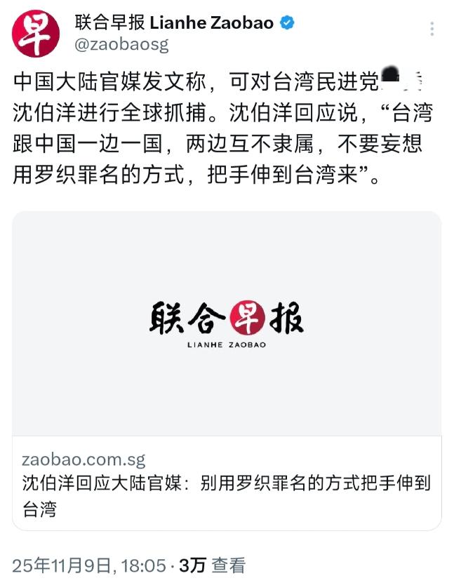 新加坡联合早报11月9日晚报道:“中国大陆官媒发文称,可对台湾民进党民代沈伯洋进行全球抓捕。沈伯洋回应说,‘台湾跟中国一边一国,两边互不隶属,不要妄想用罗织罪名的方式,把手伸到台湾来’。” 别觉得“全球抓捕”是吓唬人,重庆公安早就以“分裂国家罪”把他盯上了,证据都在一点点凑齐。他搞的那个“黑熊学院”,早被人看穿是搞“台独”的窝点,打着“民防训练”的幌子教人造反,还鼓吹“全民皆兵”,分明是给台海添乱。 更缺德的是,他还借着这由头赚台湾人的黑心钱,美国在台协会一喊“备避难包”,他立马推出“防灾盒”,成本才三百块,他敢卖1380新台币,里面连正经急救用品都没几样;一堂“战时种菜课”喊到三千多块,纯纯赚老百姓的焦虑钱。 真当自己的猫腻没人知道?他就是外国势力的提线木偶。侯汉廷早把他的底揭了,他的“台湾民主实验室”,五年拿了美国国际开发署135万美元资助,还通过索罗斯的基金会捞钱,连“黑熊学院”都收过美国在台协会的好处。嘴上喊着“守护台湾”,转头就拿外国人的钱干分裂祖国的事,这不是汉奸卖国贼是什么? 他可别忘了,再嚣张也扛不过法律的拳头,这拳头可不分地界。缅北的白家父子当年多嚣张?手里握着两千人的武装,管着41个电诈园区,骗了几百亿,还害死六个中国人,到最后不照样被抓回大陆受审? 再看黎智英,当年在香港威风得很,勾结外国势力乱港,现在呢?已经被判了好几回,关在牢里还得接着审,连自家族谱都把他除名了,这辈子大概率要在牢里过。沈伯洋干的事比黎智英更毒,又搞分裂又通外国,下场只会更惨。 别以为躲在台湾就安全,更别想跑出去避风头。中国有《引渡法》,跟25个国家都签了引渡协议,就算没签的,也能互相帮忙抓。以前多少外逃的罪犯,跑多远都被抓回来了,沈伯洋只要敢踏出台湾,落到有合作的国家手里,分分钟给引渡回来。他现在也就只能在台湾耍耍嘴硬,真敢出去试试,恐怕机场都出不去。 国台办早说了,对“台独”顽固分子要终身追责,就算他不来受审,照样能定罪。沈伯洋现在蹦得越欢,将来摔得越惨。白家父子的结局、黎智英的牢狱之灾,都是给他写好的前车之鉴。等清算那天到了,他欠国家和人民的,迟早得还,这辈子把牢底坐穿,跑不了。
