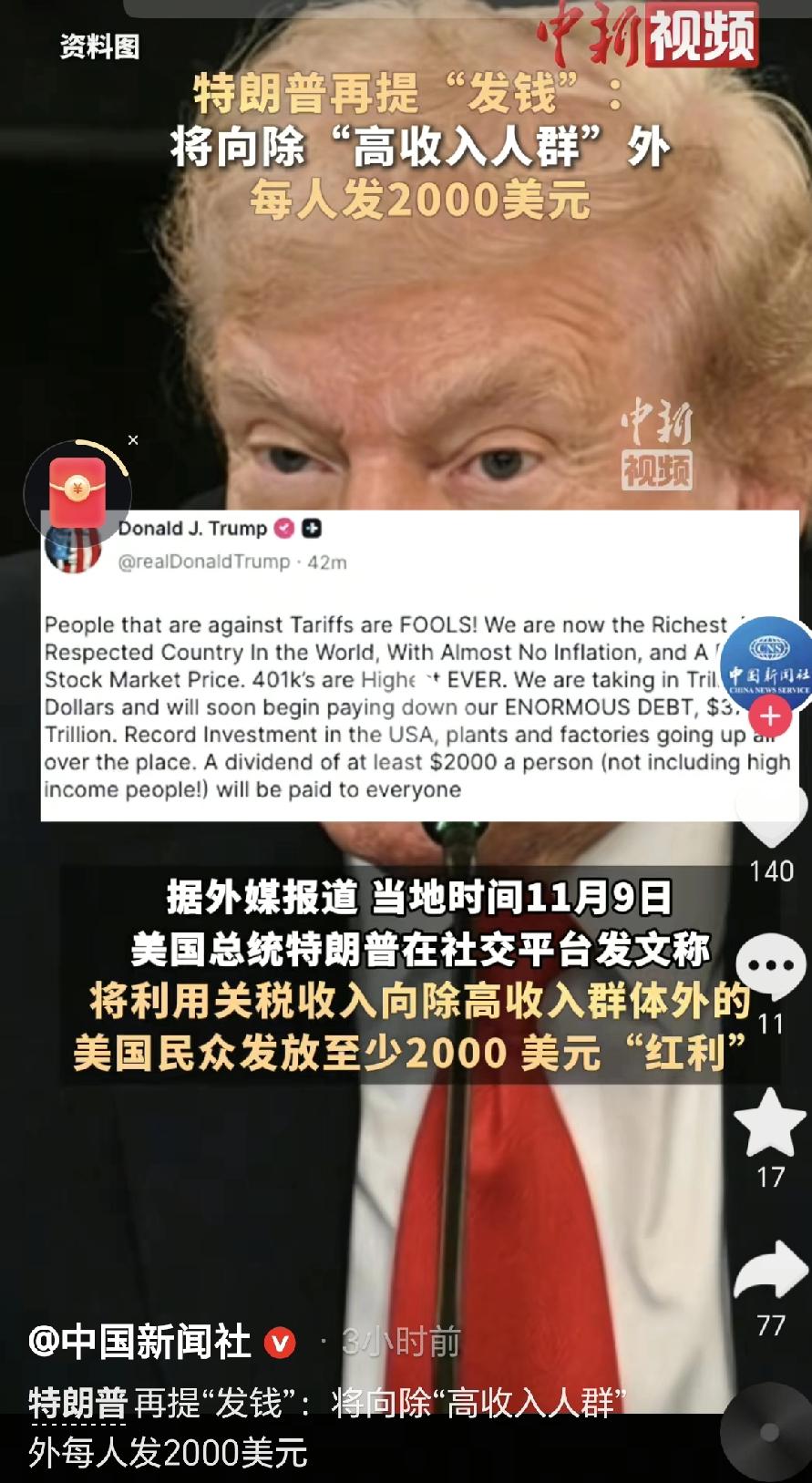 特朗普又搞新动作!突然表示要给每个美国人发2000美元,钱还得从关税里出?这波操作让最高法院都沉不住气了! 把关税当成"摇钱树",特朗普还大大咧咧放话:现在的美国有钱得很,工厂一个接一个开工,到处都是热闹景象。但明眼人都清楚,这钱其实是羊毛出在羊身上,最后还是得老百姓自己掏腰包。政府都关门一个多月了,公务员都排着队领救济金过日子,这时候突然撒钱,到底是真的想帮老百姓,还是又在作秀呢? 更绝的是这招"悬赏式发钱"——钱先捏在自己手里不发,反倒先放话让大家去给最高法院施压。9个大法官就这么被他架在火上烤:要是判我输,那2000美元可就泡汤啦!这哪是真的要发钱,分明就是拿这当政治筹码呢。 评论区这下彻底吵翻了:有人喊着"特朗普万岁",更多人却骂着"全是谎言"。同一个美国,却有完全不一样的看法。现在大家都用立场代替事实说话,发钱反倒成了撕裂社会的火药桶。 从这件事就能看明白:天上掉下来的馅饼,往往藏着钩子。您觉得这2000美元,最后到底会不会真的进老百姓口袋,还是又成了选举前画的大饼呢?