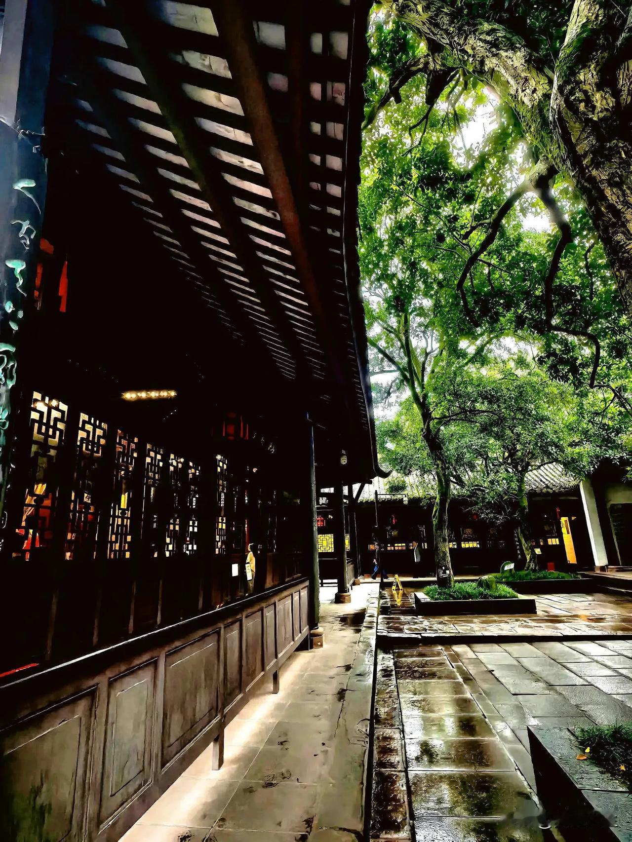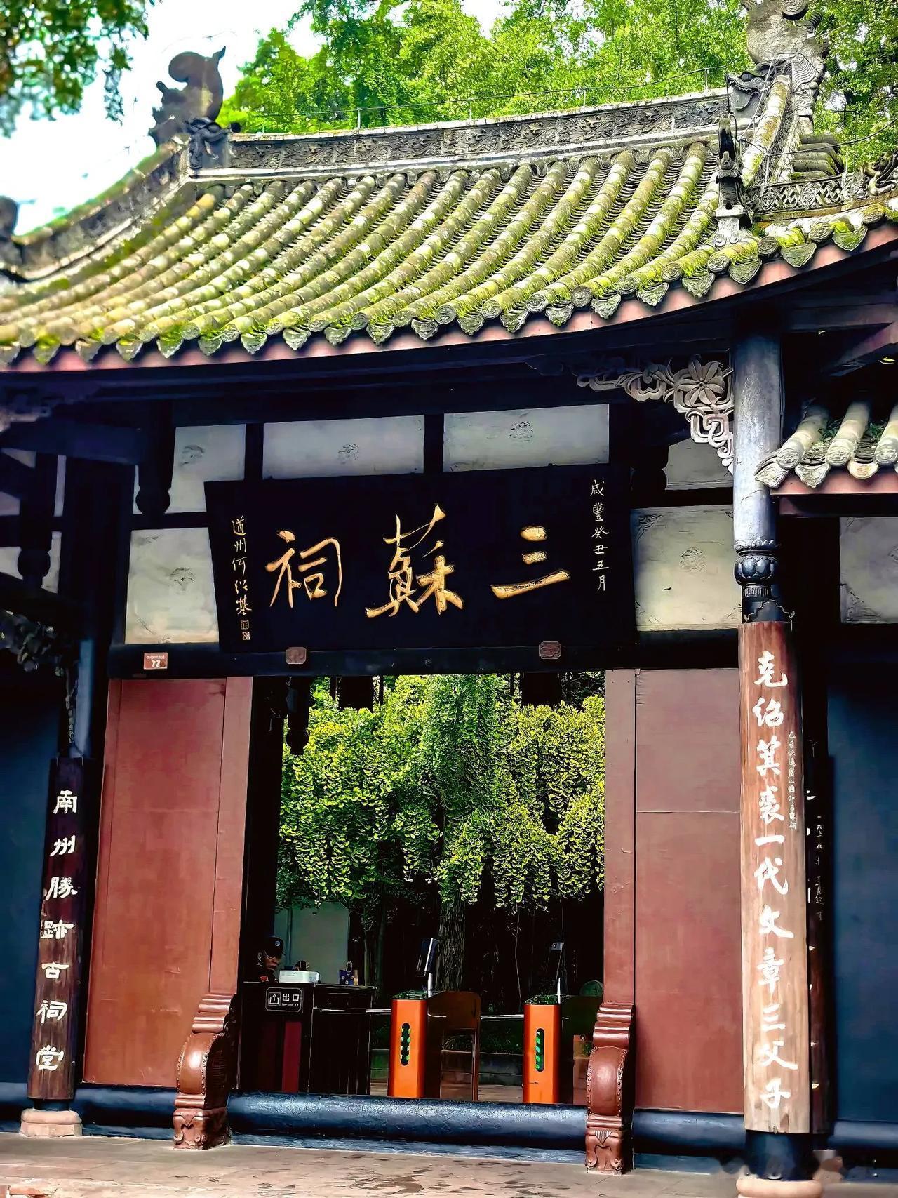 踏入三苏祠,红墙黛瓦,雕梁画栋,花木葳蕤,碧水依依,占地106亩的祠内,保存有16处古建筑,呈现出“三分水,两分竹,祠在水中央”的西蜀园林特色。祠堂区为三进四合院,主体建筑飨殿、启贤堂、来凤轩,保留着传统祠堂风貌,飨殿建于清康熙四年,殿内供奉着苏洵、苏轼、苏辙塑像,正中悬挂“养气”匾,彰显着三苏的浩然正气。