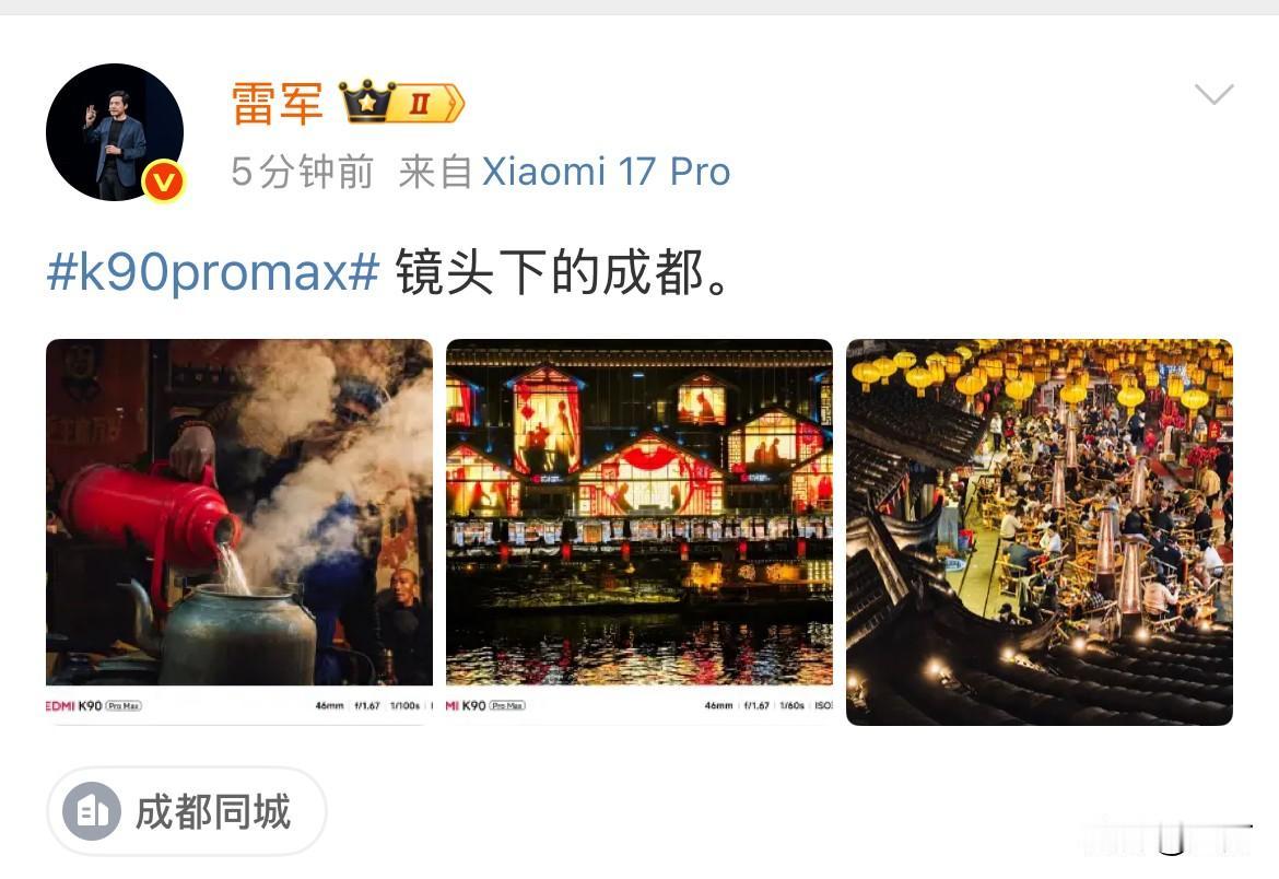 雷军:这是镜头下的成都! 就在刚才,雷军在社交网络分享了三张照片,第一张照片下面是一个茶壶上面是一个茶正在往茶壶里面到开水,由于这个天气已经有点寒冷了,所以茶壶里面热腾腾的蒸汽慢慢地溢出来了,在冬天里面给人一种温暖踏实的感觉! 而这种感觉也是这张照片的主题,给人一种成都安逸舒适温暖的生活氛围! 第二张照片是从第二层楼的角度拍的,下面是一串的普通市民,在光线温暖的夜晚喝着茶聊着天,摆着龙门阵祛除一天的疲惫,这种生活状态很成都! 第三张是一张远景的照片,看起来内容既生活化,又十分的具有浓郁艺术氛围,可以说这三张照片把视觉、味觉、感觉,都烘透的温暖舒适,满满的成都味道! 只是他们又说这照片是谁拍的[捂脸],难不成是他亲自跑到成都来拍的!