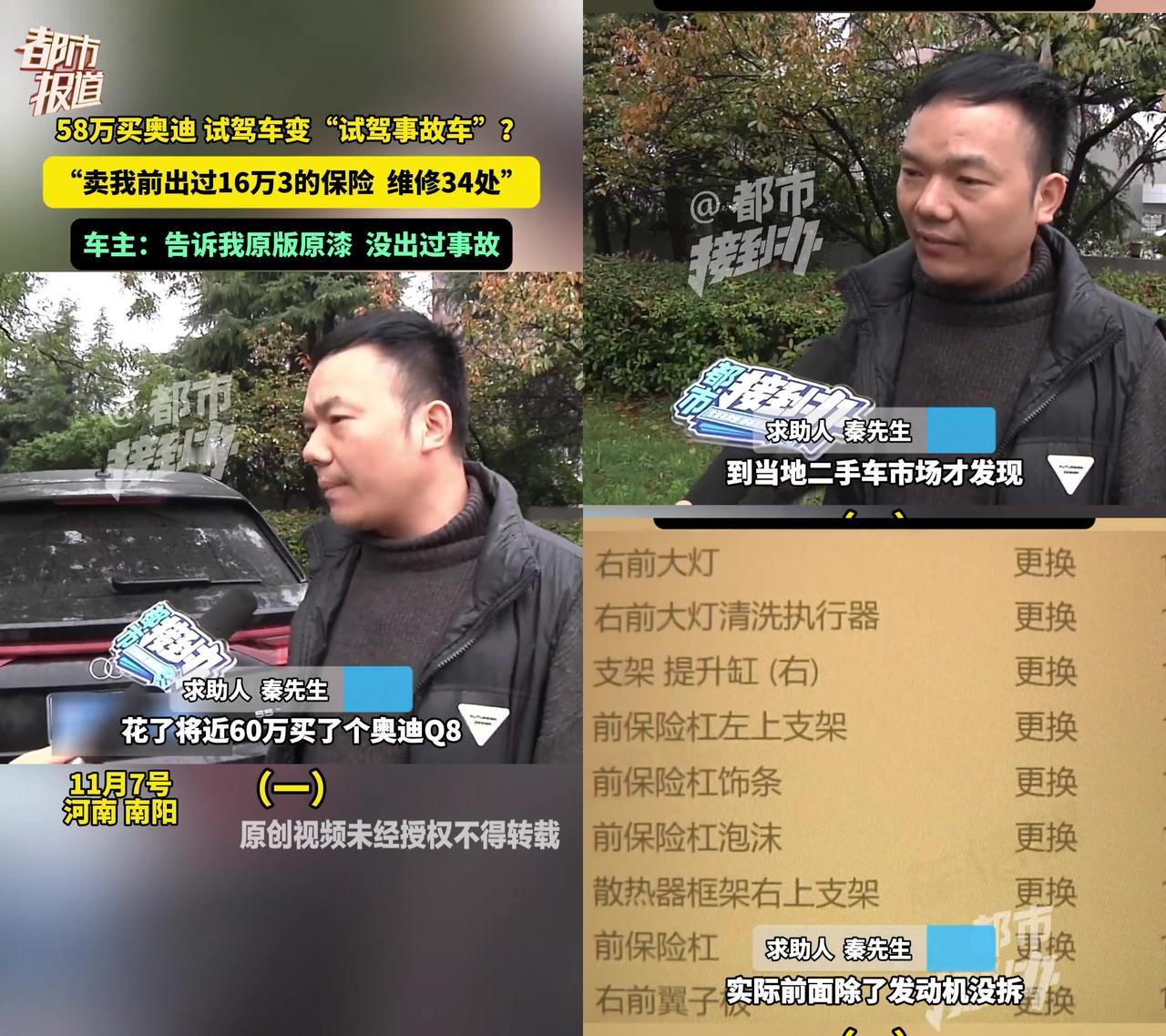 谁能想到,58万买奥迪试驾车的开心,3天就变成抱着保险单哭? 南阳秦先生11月买的奥迪Q8试驾车,销售拍胸脯说“原版原漆没事故”。 结果一查,之前出过16万理赔,34处维修,连大灯都换了! 有人说“必须退一赔三,这就是欺诈”,也有人问“60万买新车不香吗?为啥选二手?” 还有人点出痛点:“买前啥都不知道,买后全暴露,这坑挖得太狠!” 最气的不是钱,是掏真心信销售的保证,结果被当冤大头耍! 试驾车是试性能的,不该是藏事故的遮羞布啊! 你们有没有过买前当上帝,买后当冤种的事?大家怎么看?