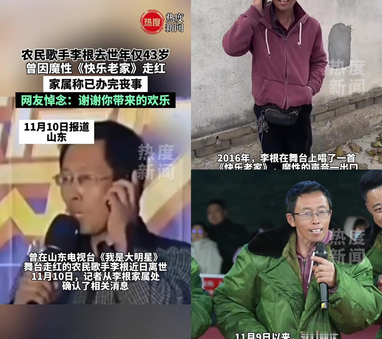 2016年趴在奶奶热炕头笑到直拍腿的《快乐老家》,有人跟我一样吗? 就是山东那个农民歌手李根,魔性的“天亮就出发”一出口,评委直接笑趴,我把奶奶的花生都碰撒了。 昨天刷到他的账号,下面全是“笑过你无数次,这次真的笑不出来了”,他才43岁,刚办完丧事。 有人说他是舞台奇葩,也有人说我们都是另一个李根。 是啊,他被嘲笑过自以为是,可本质是想发光的普通人;我们笑过他傻气,说到底是羡慕他敢在众人面前做自己。 现在红着眼才懂:他攒了一辈子的傻乐,换了我们半辈子的甜回忆。 社保还没交完,他就急着去天堂唱歌了。 你当年看李根时,是和谁一起? 想对天上的快乐歌手说句什么?