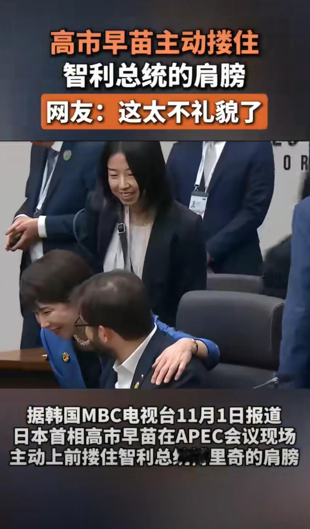 快讯!快讯! 据韩媒11月1日报道,APEC会议现场,日本首相高市早苗主动上前,搂住智利总统博里奇的肩膀。 网友质疑:“刚认识的人,能随便搂人家肩膀吗?这太不礼貌了。” 时间节点很关键。高市早苗10月21日才上任,这是她首次参加APEC峰会,上任还不到两周。 这已经是第三次了。 10月31日,同样在APEC会场,她看到印尼总统普拉博沃坐在旁边,双手扶桌面,直接把椅子滑过去凑到对方身边。 当时网友评价“公关能力强”、“外交手腕灵活”。可现在看,这套动作用多了就变味了。 10月28日的场面更夸张。她跟特朗普在美军“乔治·华盛顿”号航母上互动,特朗普介绍她时,她满脸笑容挥拳、身体转一圈向全场打招呼。 日本网民直接破防,批评她“谄媚”、“夸张”、“看起来就像特朗普的狂热支持者”、“有失日本颜面”。 唯一被称赞的是10月30日向韩国国旗行礼。韩媒罕见报道称“这通常在领袖峰会看不到”、“展现了重视礼节的形象”。 可问题是,向国旗行礼本就是基本外交礼仪。这都能成加分项,反而说明其他表现的拘谨。 外交经验几乎为零。 高市早苗此前担任过多届内阁要职,但都是国内事务。2022年担任经济安全保障大臣,管的是政策研究,压根没接触过多边外交。 她是安倍晋三一手提拔的核心干将,竞选时直接喊“继承安倍遗志”。安倍擅长“高尔夫外交”、“拉家常式会谈”,跟各国领导人都能打成一片。 可安倍有30多年的从政经验,高市早苗上任不到两周就代表日本出席APEC,这本身就很冒险。 国内根基也不稳。联合执政的自民党和维新会,众议院合计席位没过半数。刚任命的内阁里,7人涉“黑金”丑闻。 说白了,这就是经验不足的代价。 外交场合不是联谊会,肢体语言有文化讲究。日本传统外交向来克制,突然频繁出现“滑椅子”、“搂肩膀”这些动作,国内外都看不下去。 对特朗普热情过头,对其他国家领导人也“亲密”过头,频繁的肢体接触反而消解了外交的严肃性。 更要命的是,智利总统博里奇36岁,主张多边主义和平等外交。高市早苗64岁,这种“过度亲密”的姿态,在他看来也未必是尊重。 安倍用30年建立的“亲民外交”风格,她想用两周复制。结果就是现在这样,每次互动都上热搜,评价越来越两极。 各位读者你们怎么看?欢迎评论区留言讨论 。