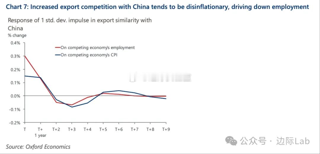 与中国日益激烈的出口竞争,对竞争国的就业和通胀构成了显著的下行压力。脉冲响应分析显示,当与中国的出口相似度出现一个标准差的冲击后,竞争国的就业水平在经历一个短暂的微弱上升后便迅速转为负增长,并在冲击后的第二至第三年达到负向峰值。与此同时,该国的消费价格指数(CPI)也同步承压走低,呈现出持续的通缩效应。这一动态过程表明,来自中国的竞争加剧在中期内会转化为对竞争国劳动力市场和定价能力的双重挤压。