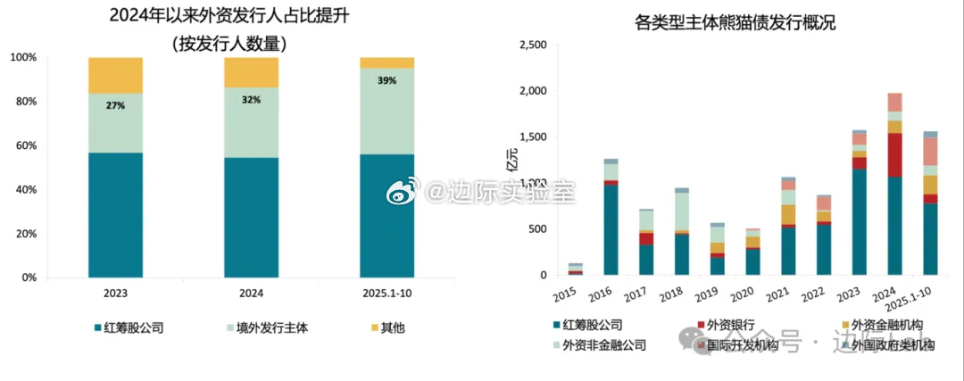 熊猫债的发行主体正经历一场深刻的结构性优化,市场日益走向多元化,境外发行人的参与度显著提升。按发行人数量计,境外主体的占比已从2023年的27%攀升至2025年前十个月的39%。市场已不再局限于早期的国际开发机构,而是成功吸引了包括匈牙利、埃及在内的主权政府,德意志银行、加拿大国家银行等国际性商业银行,以及梅赛德斯-奔驰、宝马、巴斯夫等全球知名跨国企业。这种跨地域、跨行业的发行人结构,标志着熊猫债市场对全球高质量发行人的吸引力正在增强,其作为人民币国际化载体的功能也日益深化。