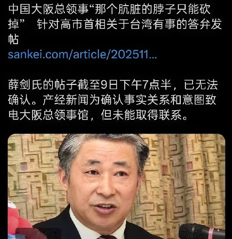 跟畜生讲话,就得用畜生听得懂的语言!高市早苗一个日本政客,竟狂言“台湾有事或动武”,简直是踩中国红线踩得肆无忌惮。 薛总领事一句“斩断擅自闯入的肮脏头颅”,怼得大快人心!这哪是外交温和话术,是憋了一肚子火的正义反击,难怪网友纷纷叫好。82%日本网民支持高市早苗,可见反华氛围有多浓,但他们举报封号、喊“生命威胁”的过激反应,恰恰证明这话戳中了痛点——他们听惯了软话,受不了硬气反击。 我的观点很明确:对不讲理的人,温和是软弱;对碰红线的人,客气是纵容。用他们能懂的“硬话”立规矩,就像用条件反射训畜生,多讲几次,他们自然就适应了。 你觉得薛总领事的话风该坚持吗?对付这种狂言,还该有啥招?来评论区聊聊!