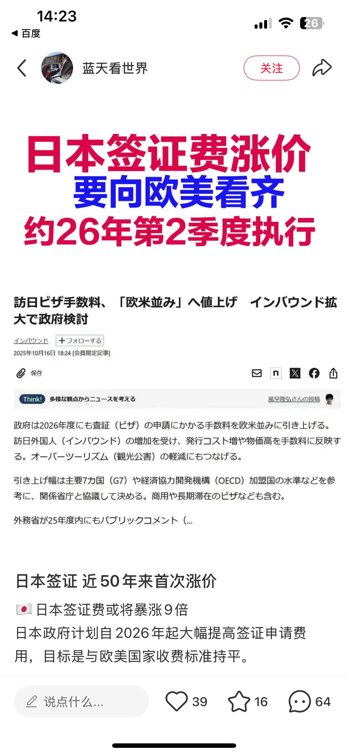 疯涨9倍!日本签证费要收1300元 穷游党直接被劝退? 11月11日日本各大媒体集体官宣 2026财年起外国游客单次签证费将飙至1300元左右 这是1978年以来近50年首次涨价 9倍的涨幅直接把之前142元的白菜价踩在脚下 官方直言要靠价格杠杆筛游客 应对每年近4000万的入境客流 京都大阪挤到水泄不通 清水寺伏见稻荷大社全是人头 当地居民吐槽公交挤不上 生活空间被占满 日本打的算盘很精 既想挡走预算有限的穷游党 留住能买买买的富裕游客 又能靠签证费增收 改善景区设施和公交 这波操作直接搅乱旅游市场 穷游党哭晕 签证费翻倍加上旅行团涨价 日本游成本飙升 转投东南亚性价比更高 依赖大旅游团的日本小商贩倒能喘口气 中国游客只要体验够好 未必会被涨价劝退 但前提是增收的钱真能用到实处 麻烦的是加价不止签证 42个地方政府已开征住宿税 京都还要把住宿税涨到每晚1万日元 多重加价可能让游客彻底放弃 而且热门城市挤小众地区冷的核心问题没解决 涨价只是治标不治本 你愿意花1300元办签证去日本吗 日本靠涨价筛选游客 是能优化体验还是会砸了旅游饭碗 来评论区说说你的想法