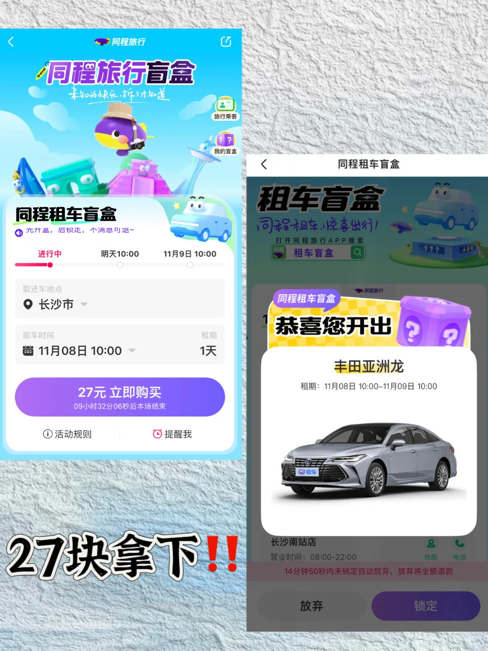 这次去浏阳是在「同程旅行」27元租车盲盒超超超香!放心冲😍打开同程旅行🔍27盲盒,就OK⏰选取车点和时间,付款开盒就行啦~ 💰27元包含租车费、服务费+基础保险,一个字爽‼️