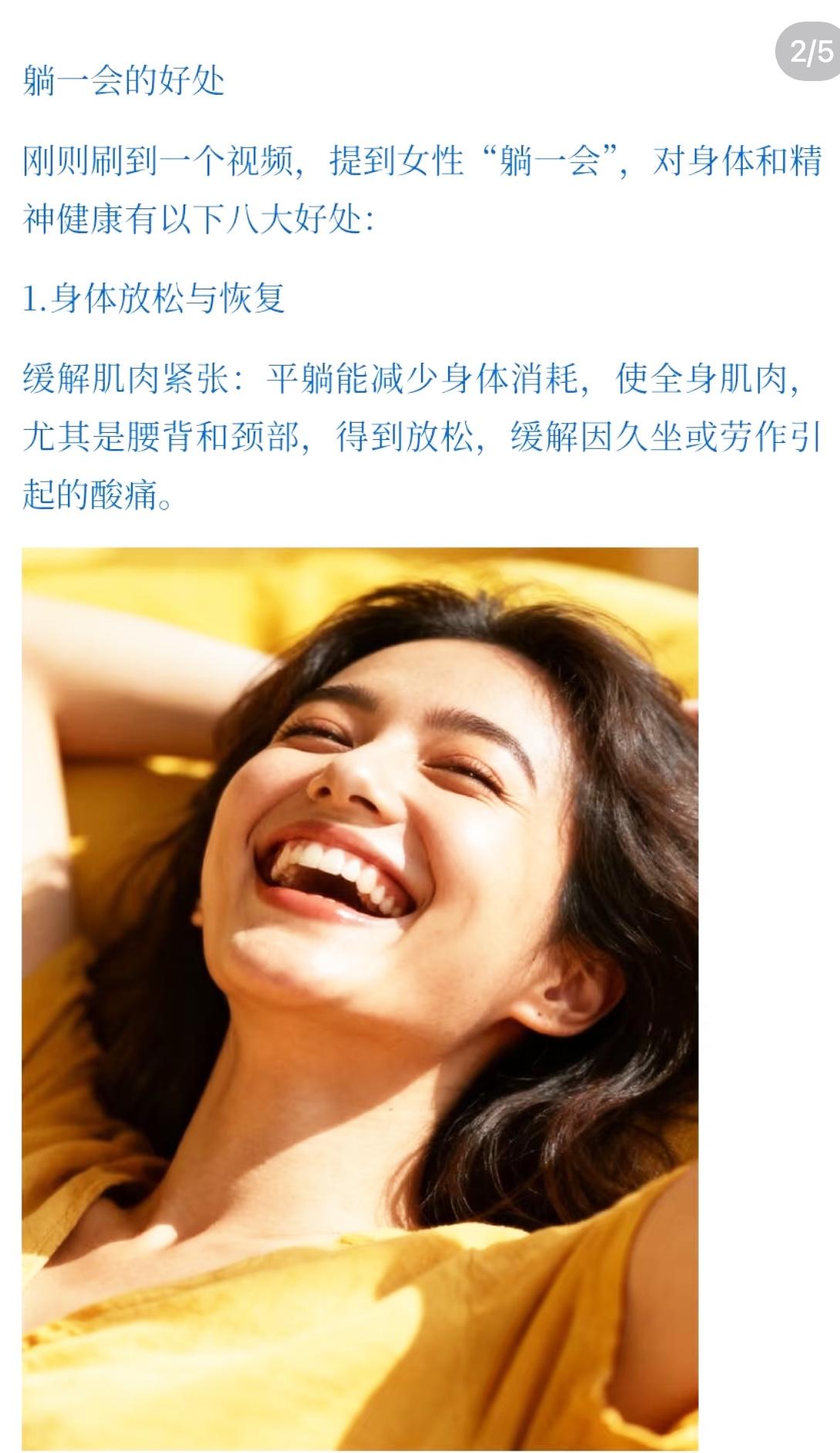 终于知道身体垮的原因了 医生说:女人最好的状态是“躺一会”,吃完饭躺一会,洗完澡躺一会,下班了躺一会,看手机累了躺一会,躺累了翻个身再躺一会…这样有助于身体健康。 原来医生说的“女生最好的状态是躺一会”,根本不是偷懒,是给身体留生路啊! 年轻时总觉得拼才是本事,起五更爬半夜是常态,吃饭狼吞虎咽赶时间,恨不得把一天掰成两天用,连坐下来喘口气都觉得浪费。那时候不懂,过度劳累耗的是气血,熬的是免疫力,这些亏空早晚要还。 现在年纪上来了,身体开始各种“报警”,腰酸乏力、头晕心悸,医生直言是年轻时透支太狠。才明白“躺一会”不是摆烂,是最低成本的修复——吃完饭躺10分钟养脾胃,下班躺一会卸压力,这是身体的自我充电,更是对自己的负责。 我们总想着先拼事业顾家庭,却忘了身体才是所有的底气。别等垮了才后悔,该躺就躺不是懈怠,是好好爱自己的智慧。你现在能安心“躺一会”吗?
