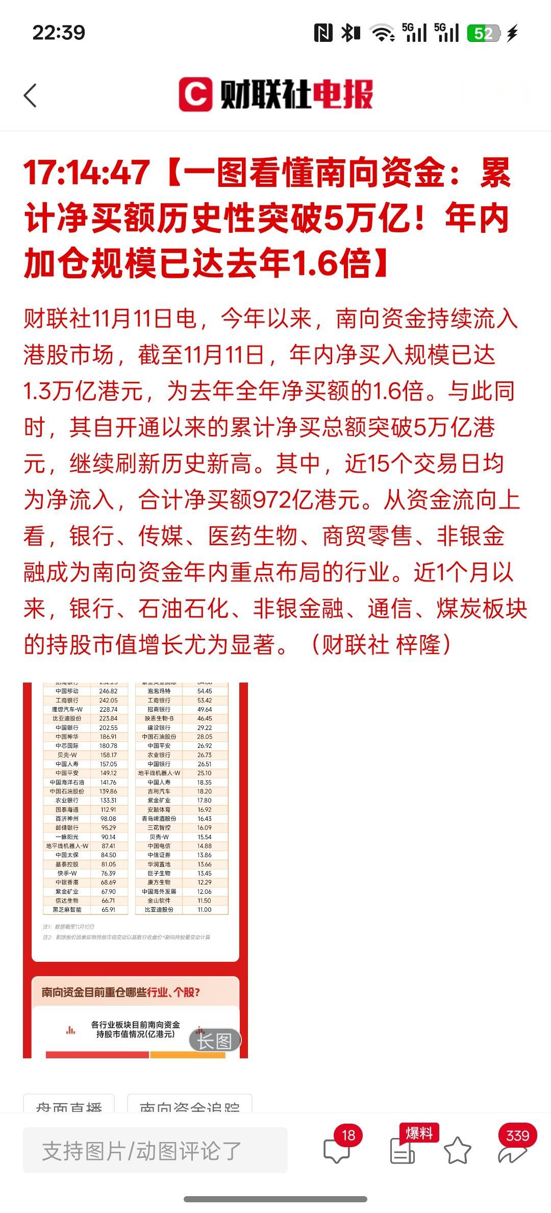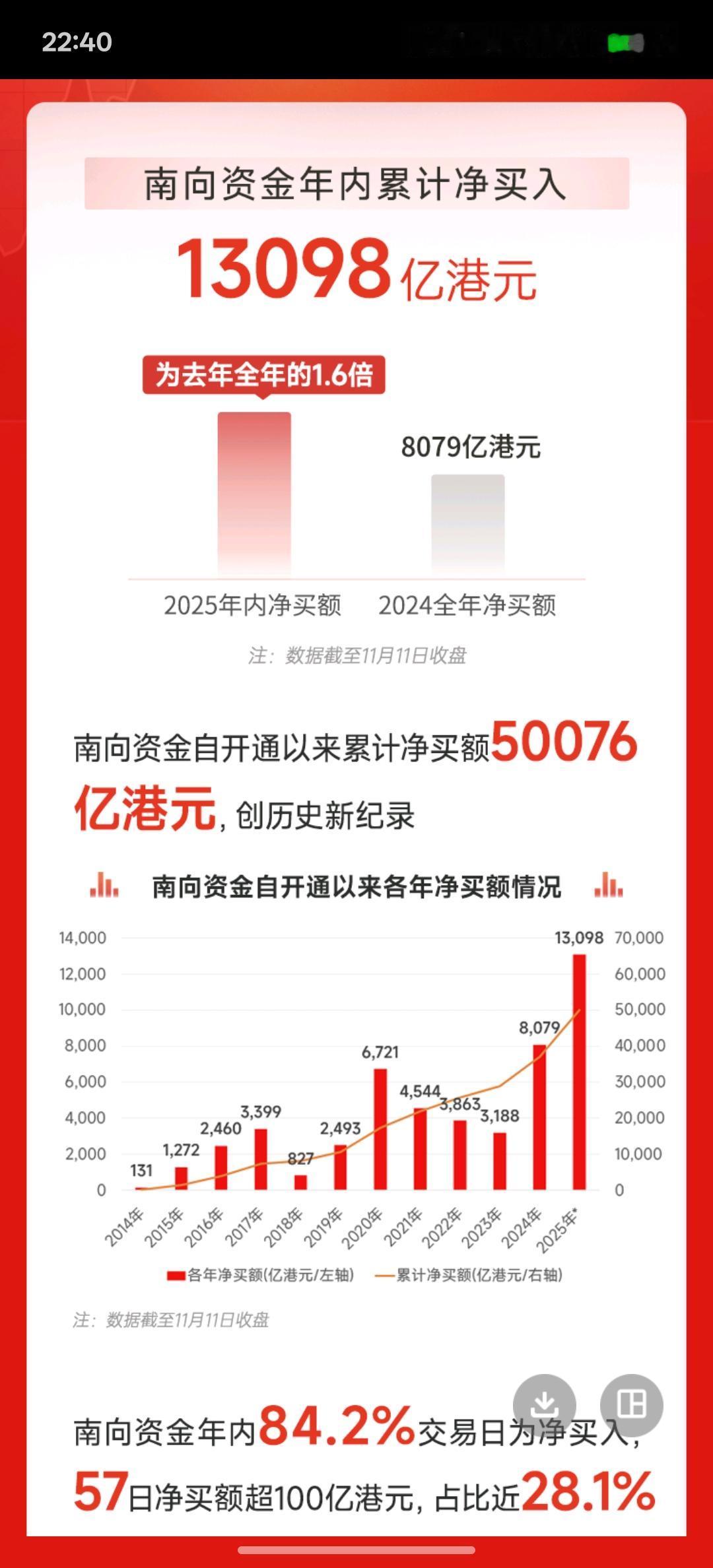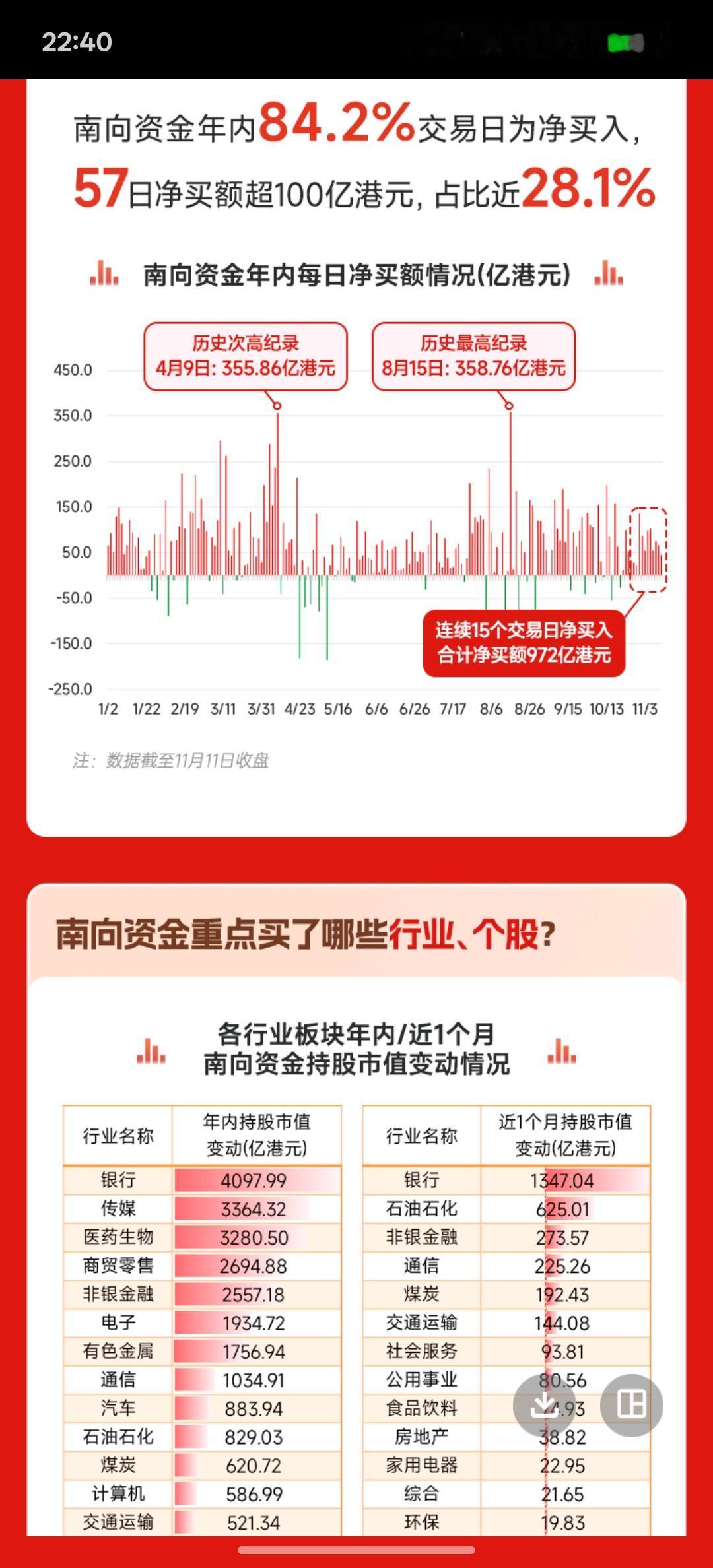 南向资金:累计净买额历史性突破5万亿!年内加仓规模已达去年1.6倍,而且今年外资买港股买了1.3万亿,外真的是大手笔,也持续的买入港股的资产!啊,外资同样也在买入A股市场的资产,今年包括高盛,摩根大通,摩根士利丹,包括韩国的投资者,阿根廷的投资者都在买中国的资产!之前贝莱德还骂骂咧咧的离开了中国A股市场,那后来中国资产价格不断的上涨,贝莱德也持续的在买入中国资产,根据之前的相关信息公布,贝莱特买银行股买到6%以上的持仓比例!所以今年以来,外资确实是真金白银,在买中国的资产主要还是看好中国资产未来的成长性以及科技创新带来的科技红利分享,同时也是中国资本市场的改革带来的资产价格估值的上涨。那外资现在买港股买的行业还是比较多。芯片半导体呀,人工智能行业,医药行业,水电也就是能源行业,包括传媒,汽车行业,我行保险都是外资比较喜欢看好的行业! 啊,今年外资持续买入,明年外资可能还会继续加码,毕竟外资也在今年的研报当中,也是持续看好中国明年股市的上涨。