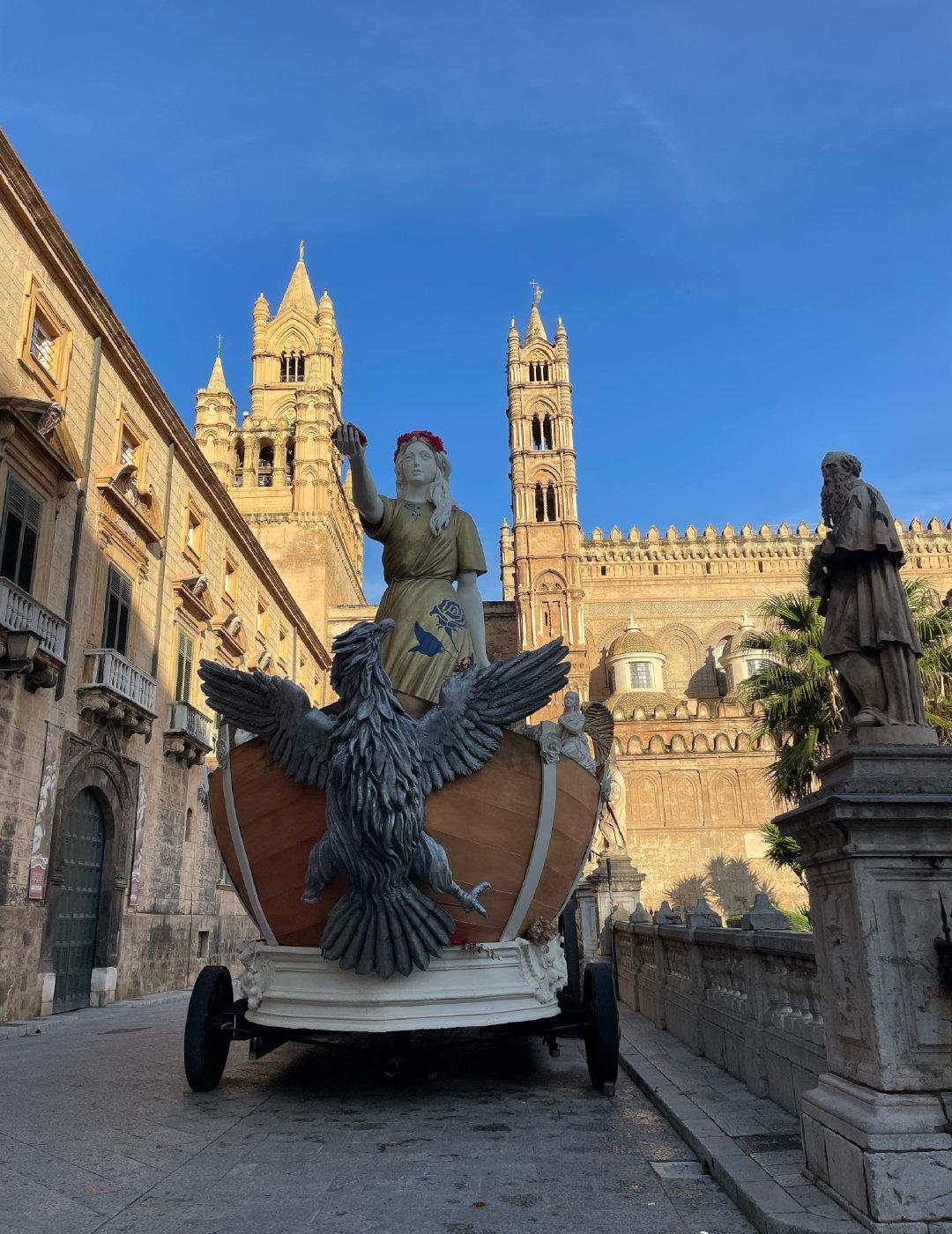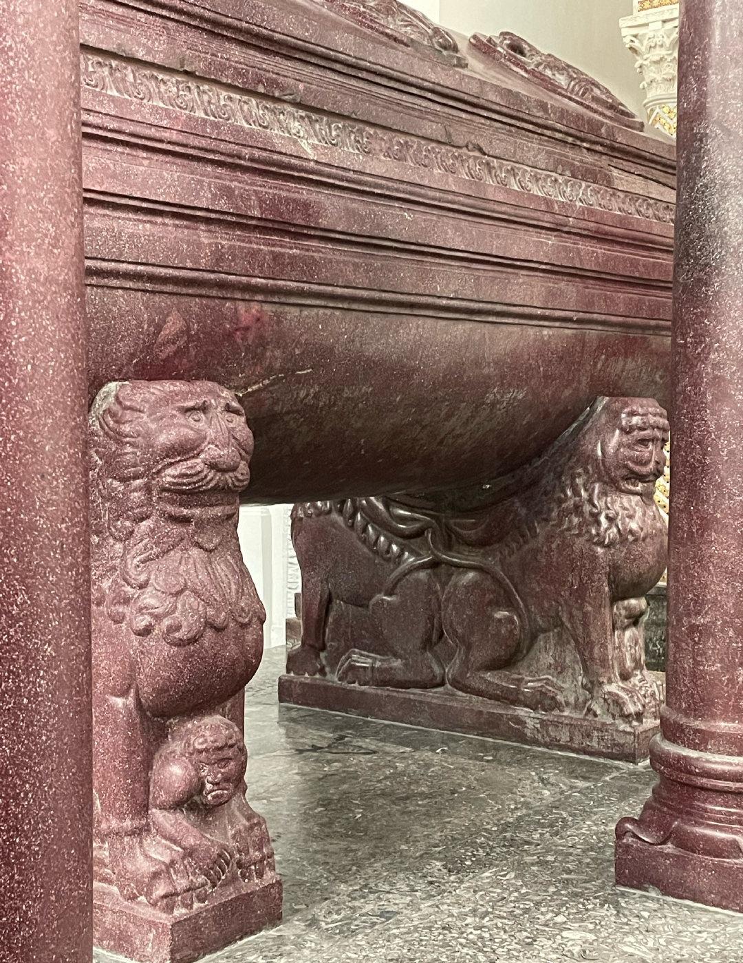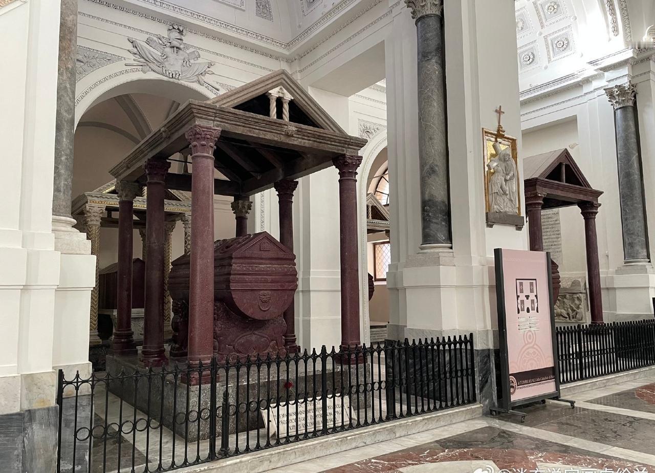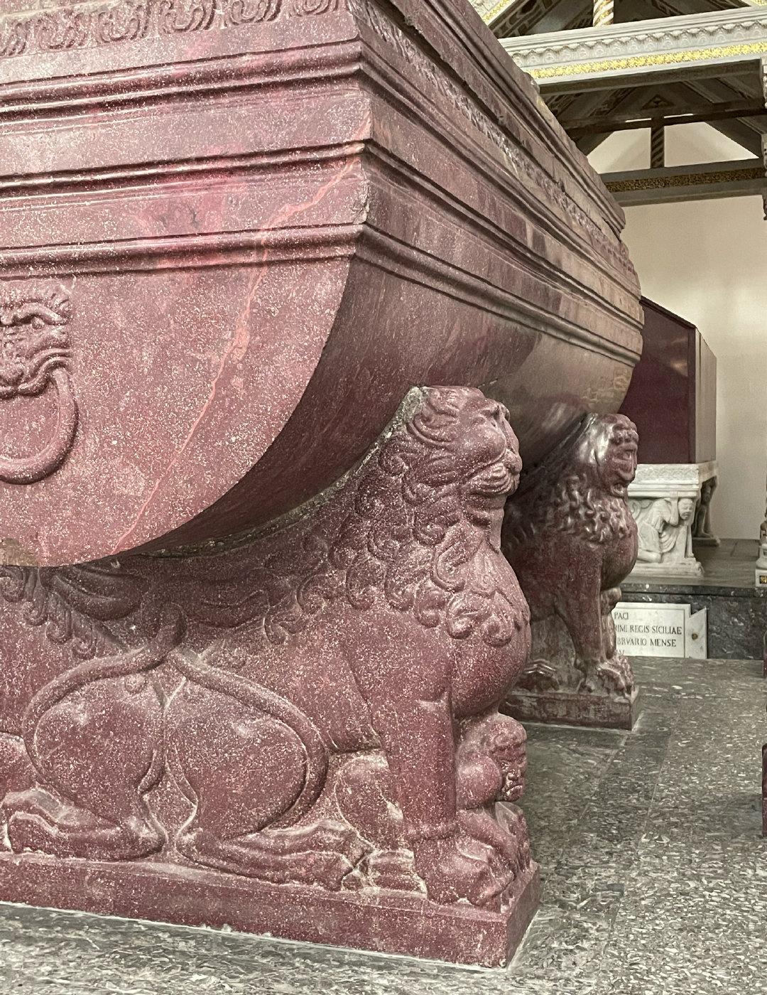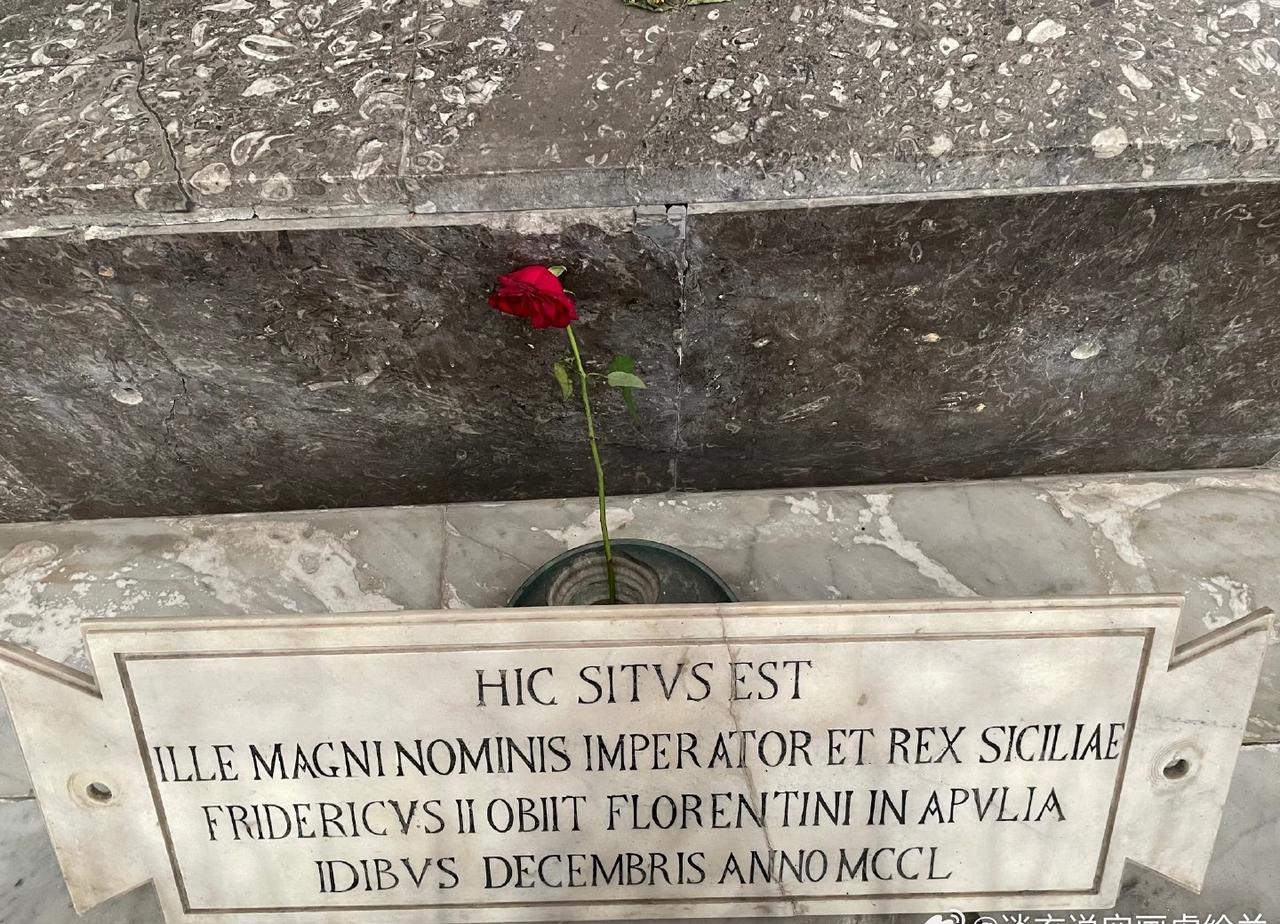 长眠于此者,是自霍亨斯陶芬家族的君主,罗马人民的国王、神圣罗马皇帝、西西里国王、耶路撒冷国王、意大利国王和勃艮第领主。 人称 (Stupor Mundi),通过谈判从萨拉丁手里收回了圣城,是教皇的养子也是诺曼西西里王国唯一的合法继承者,阿拉伯语说得搞不好比拉丁语好,虽然被开除教籍但仍然领导了第六次东征,被称为“王座上第一个近代人”的知识分子。 Federico II di Sivevia,或者那个更令人熟悉的名字,弗里德里希二世,皇帝👑