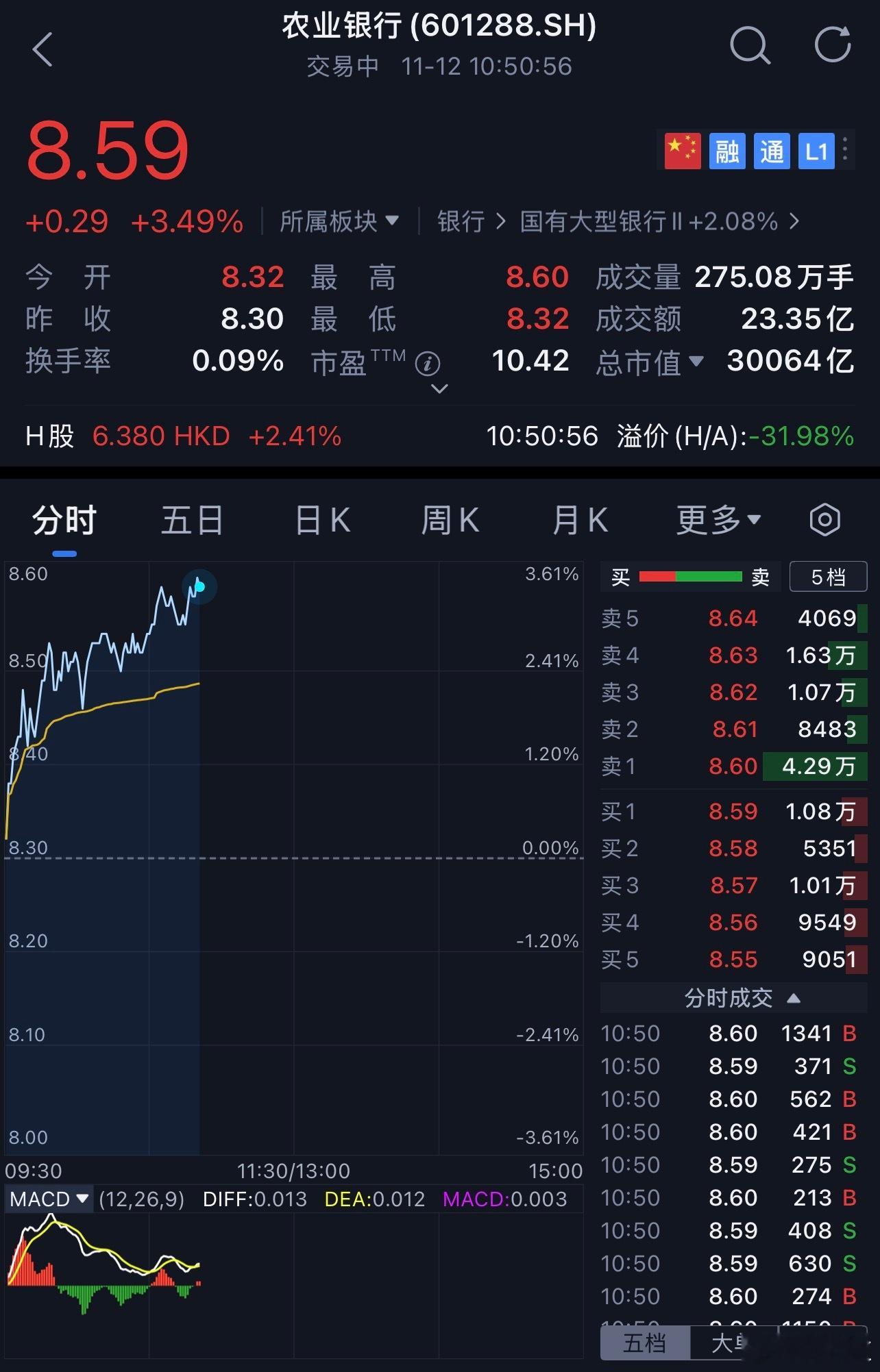 农业银行A股持续拉升涨超3%,总市值突破3万亿元,股价续创历史新高。