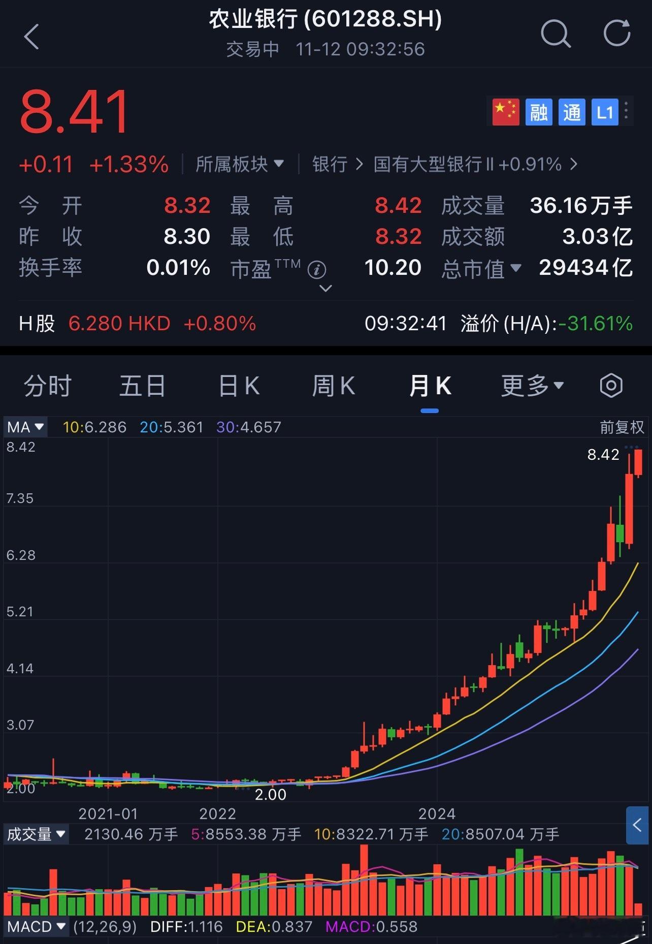 农业银行A股持续拉升涨超3%,总市值突破3万亿元,股价续创历史新高。