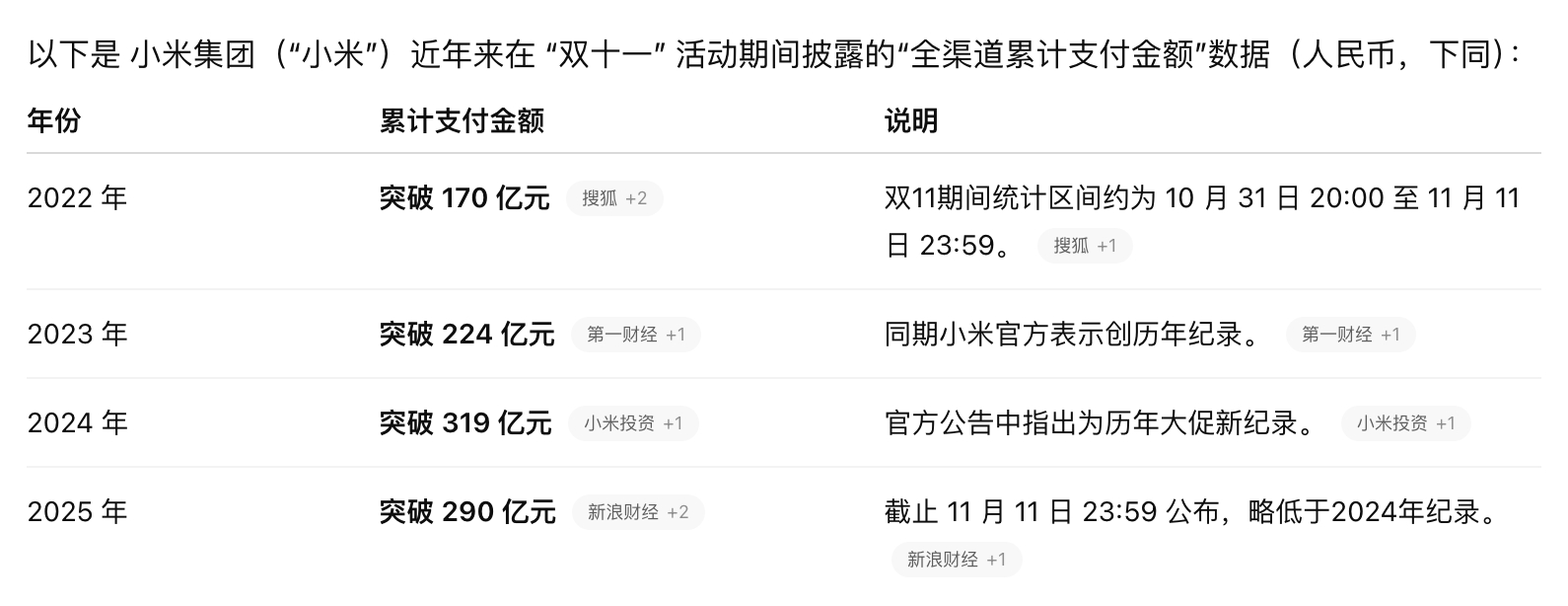 小米 2025 双十一全渠道支付 290 亿,作为对比,去年全渠道支付 319 亿元。这个表现怎么样?看起来是小幅缩水,但其实去年是个 bug 年,去年全渠道支付金额对比前年跨越非常大,主要来自国补。但今年双十一国补几乎都没了,加上整体环境不乐观,微微下降实际是表现更好了。你们说是不是?