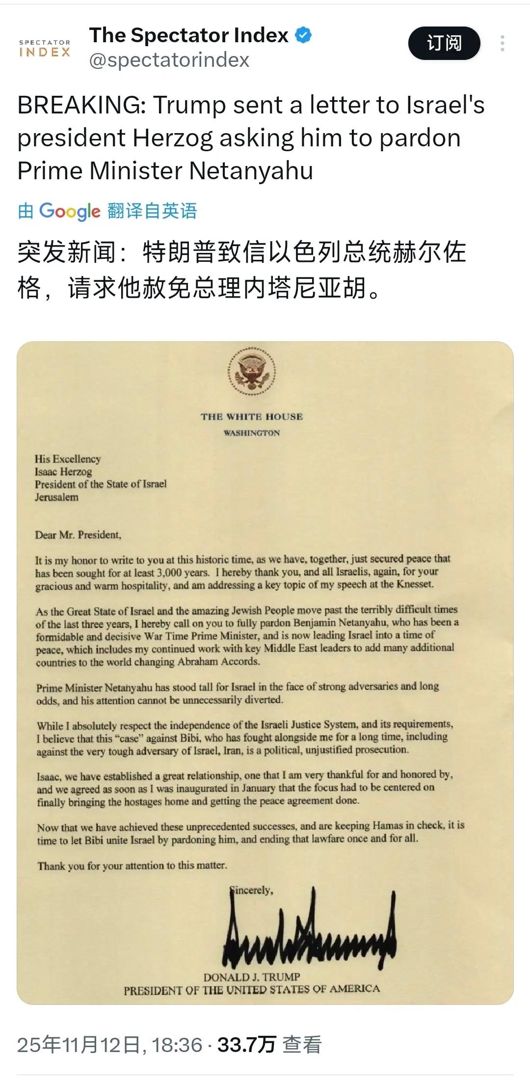 突发新闻:美国总统特朗普请求以色列总统赫尔佐格赦免以色列总理内塔尼亚胡。 今晚(北京时间11月12日晚),特朗普向以色列总统赫尔佐格发出一封正式信函,请求其赦免正因腐败和欺诈指控而接受审判的总理内塔尼亚胡。 特朗普称,内塔尼亚胡“与我并肩作战多年,在对抗伊朗问题上亦是如此”,针对内塔尼亚胡的指控是“一种带有政治色彩且毫无正当性的起诉行径”。