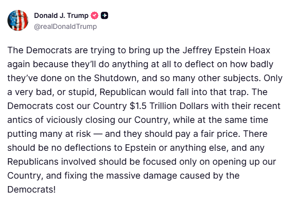 🐖 在众议院民主党党团公布美国恋童癖富豪爱泼斯坦性侵案最新证据后,特朗普再次高强度哈气:“民主党人试图再次炒作杰弗里·爱泼斯坦“骗局”,因为他们会不择手段地转移视线,掩盖其在政府停摆以及众多其他议题上的糟糕表现。”奶龙口中的“转移视线”和“糟糕表现”是自我介绍吗?