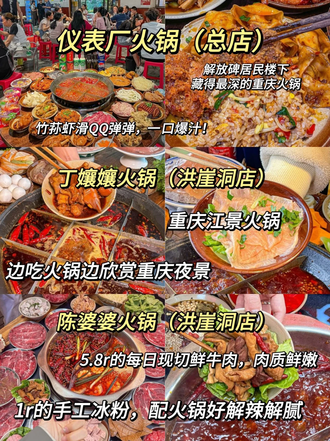 重庆小面、陈婆婆火锅(洪崖洞店)、酸辣粉、凉糕、冰粉凉虾、仪表厂火锅(总店)、豌杂面、熨斗糕、丁孃孃火锅(洪崖洞店)、山城小汤圆、烤苕皮……