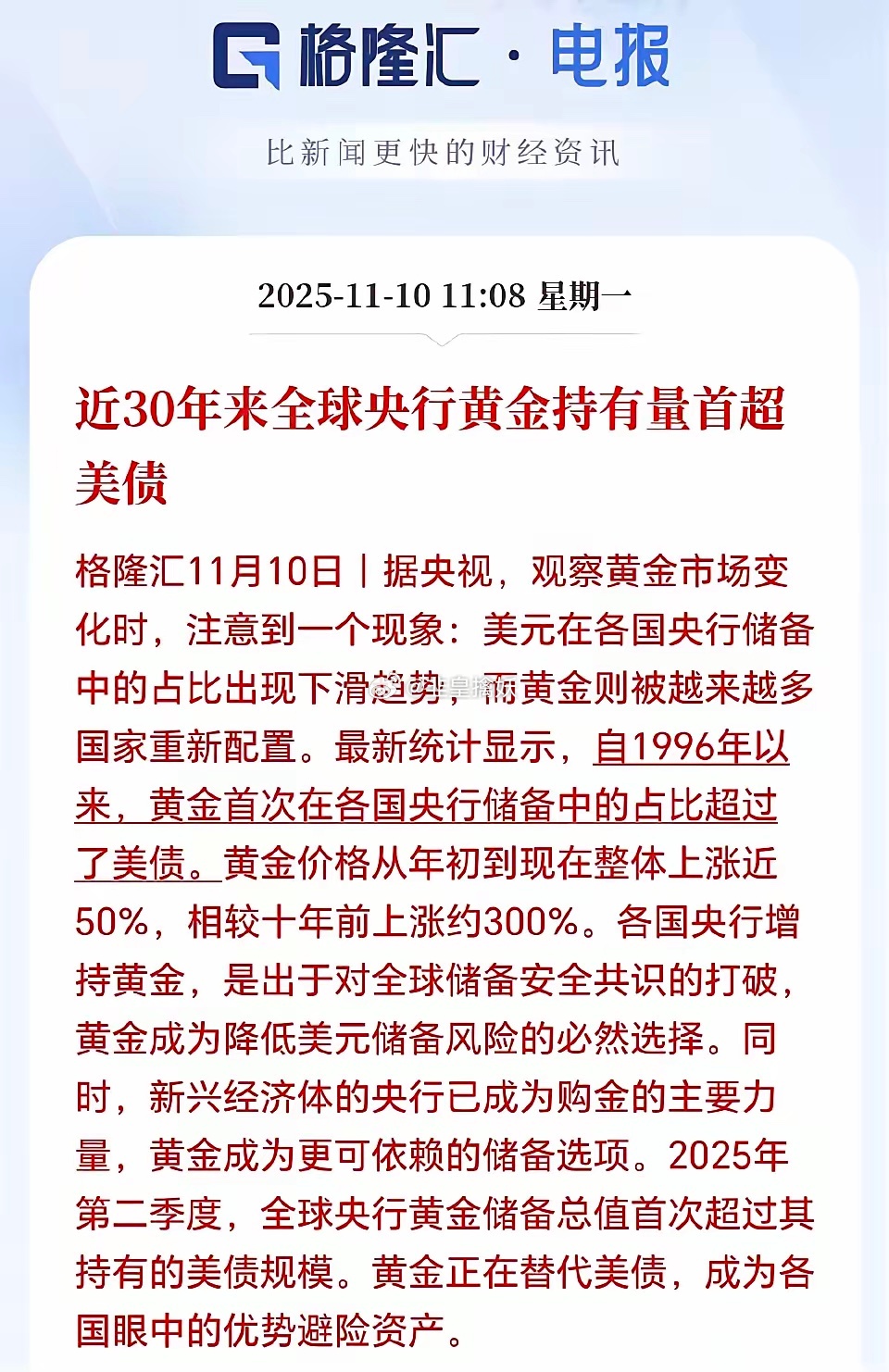 黄金又开始涨了,基本面没变,长期趋势维持前面实在短期涨太多了,从3300连续9周上涨到4400,这是没有回调的33%涨幅!两个月而已,短线获利盘太多。因此回调12%是正常的。黄金的走势和股票不一样,趋势极为顽强,多就是长多,不会几年里多空变化好多次。没人能控制,共识就是趋势。现在的共识就是,美元长期来说是垃圾,黄金长期必然大胜美元投资策略。到什么程度了?全球央行的黄金储备首次超过了美债!要记住,美债是有利息的!黄金没利息。有利息的不如没利息的,原因很简单,美债利息已经是印刷出来的,是个不可信的体系。没人能印刷黄金,南非人需要到世界最深矿井里去挖。长期目标,2027-28年7000-8000。激进的短期目标,2026年上半年6000,这是华尔街提的,有点夸张,但如果美债总额上升幅度过快,是可能的。