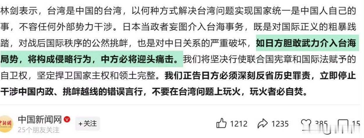 官方表态了: 若日本胆敢武力介入台海局势, 将构成侵略行为, 中方必将迎头痛击! 历史的教训还不够深刻吗? 当年的惨败下场, 现在还想重蹈覆辙。 台湾轮的到你小日子指手画脚, 抱上美国大腿又怎么样? 统一的必然趋势。 真敢迈出武力介入那一步, 就是新仇加旧恨一起算! 到时候可没地方哭去。 别以为有几个破军舰、 烂导弹就了不起, 底线就在这,谁碰谁倒霉!