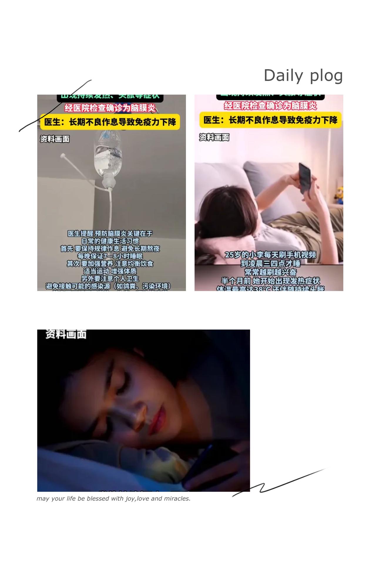 别再把深夜刷手机当放松了!浙江25岁女子刷短视频到凌晨三四点,直接刷出脑膜炎,这哪里是快乐,分明是在给健康埋雷! 手机蓝光会抑制褪黑素,让你越刷越精神,看似解压实则是“假性放松”。长期熬夜可不是累那么简单,会直接破坏血脑屏障、引发全身炎症风暴,711种基因功能都会受影响,免疫力暴跌30%以上,病毒自然趁虚而入。 从脑膜炎到肺炎,从视力暴跌到颈椎报废,熬夜欠下的债,身体迟早会连本带利讨回。年轻从不是免病金牌,睡前把手机扔去客厅、设好APP使用上限,才是对自己负责。 你现在睡前刷手机能刷多久?为了健康,你愿意尝试哪种方法戒掉熬夜刷手机的习惯?