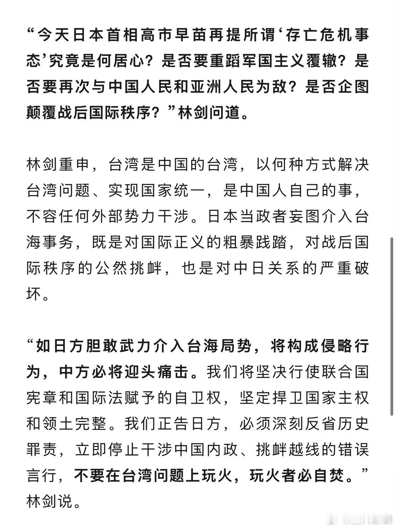 如日方胆敢武力介入台海局势,将构成侵略行为,中方必将迎头痛击。 高市早苗的危险言论仍在发酵。与日方各界有意模糊此事不同,我们显然要当个事办了。我们连续三天通过各种官媒向外界传达明确信号,胆敢越过红线,将迎头痛击。 昨晚七点的新闻,我们更是用三分钟的时间来讲事实摆道理,从军国主义到干涉内政,痛斥日方的错误言论。其中措辞强硬程度更是近年所罕见,真有大战一触即发之势。 说实话,高市早苗还是太单纯,它老师安倍都没这么虎,上台就梭哈,拿二杆子当勇敢,如此不留退路的做法,势必会将日本带入万劫不复的地狱!