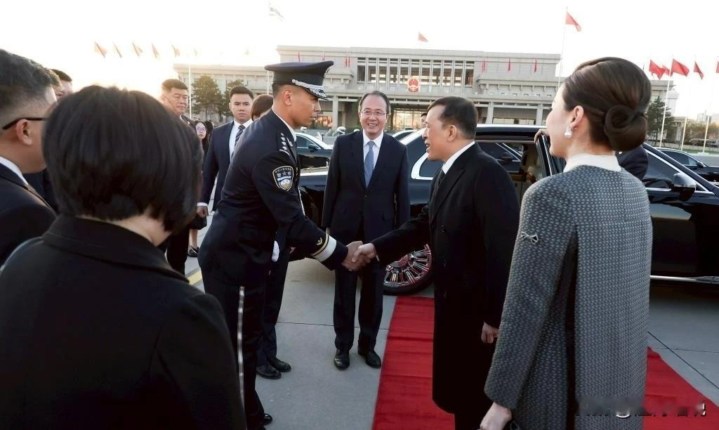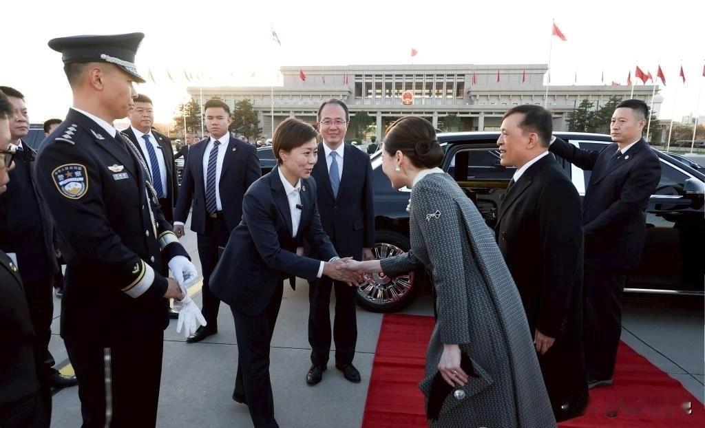 泰国国王玛哈·哇集拉隆功与素提达王后的亮相展现了王室亲民风范。 国王身着剪裁得体的黑色大衣,内搭白色衬衫与黑色领带,庄重中不失优雅;素提达王后则以灰色系大衣搭配同色裙装,手提黑色手包,彰显低调高贵的王室气质。 最打动人心的细节是,二人与警卫人员的互动:国王主动与执勤警员握手时微微前倾身体,目光温和专注;素提达王后紧随其后,向随身女警卫握手致意,并露出亲和的笑容。 泰王和王后的这些细微表情和肢体语言,诠释了"威严,但不失温情"的泰国王室形象。